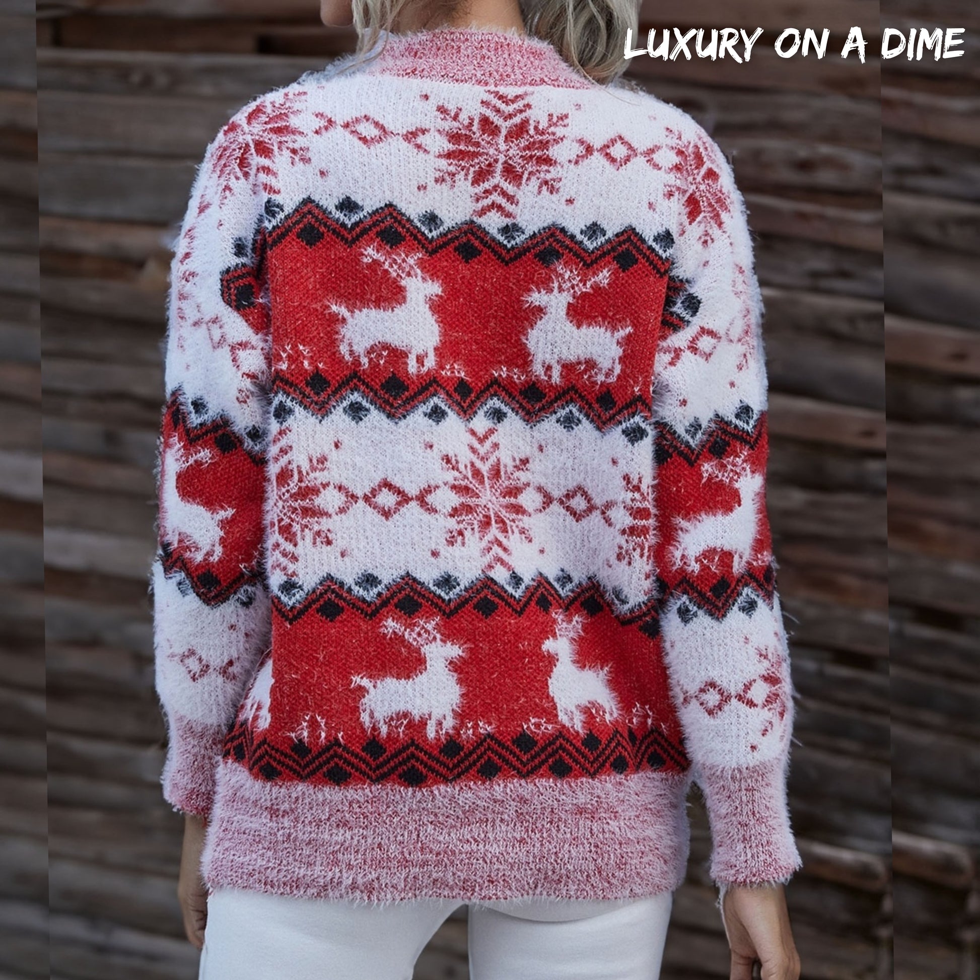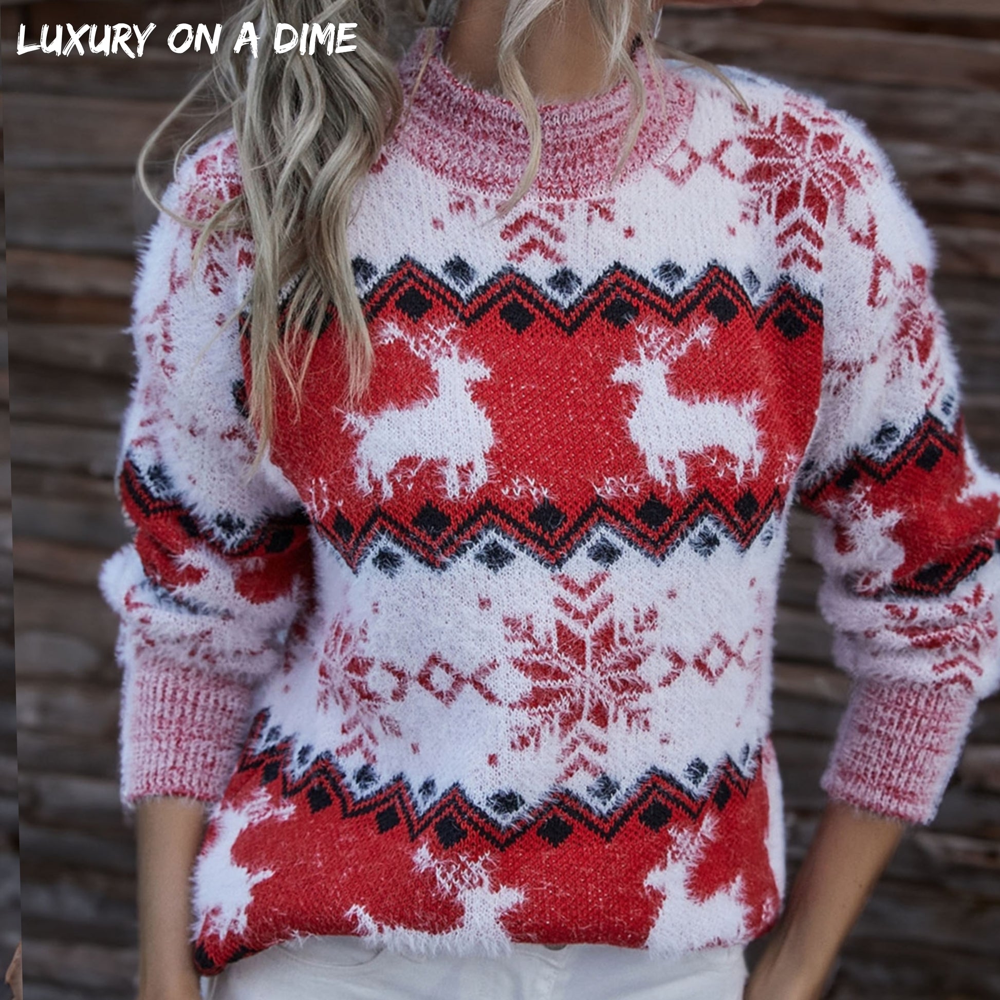 Fuzzy Fair Isle Snowflake Reindeer Knit Holiday Round Neck Minimalist Sweater