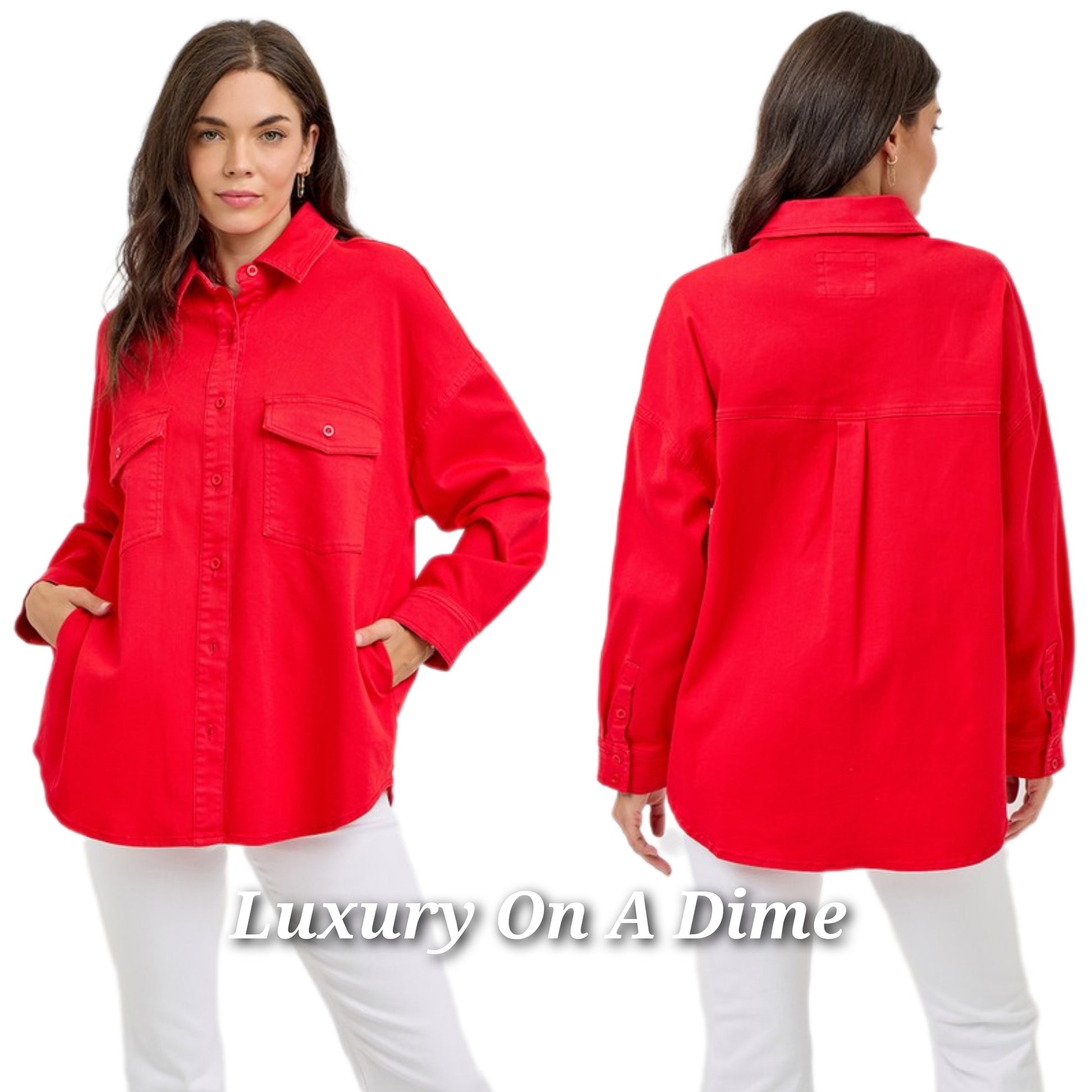 An oversized boyfriend fit provides a sleek contemporary design that lends to comfort and functionality that combines the style of a shirt with the comfort of a jacket.