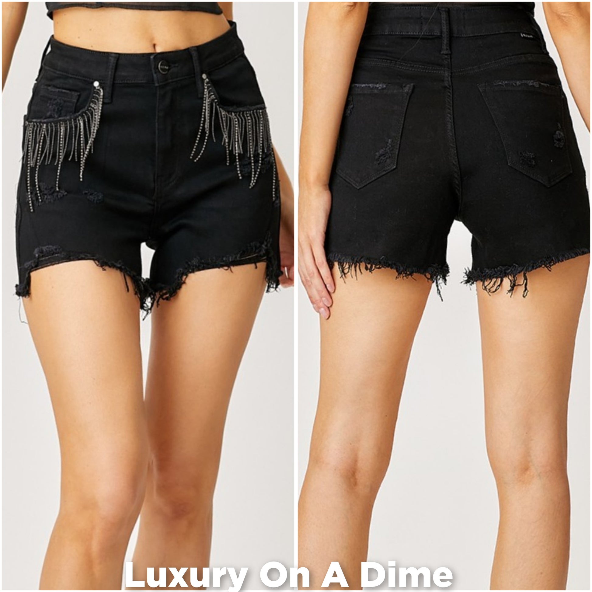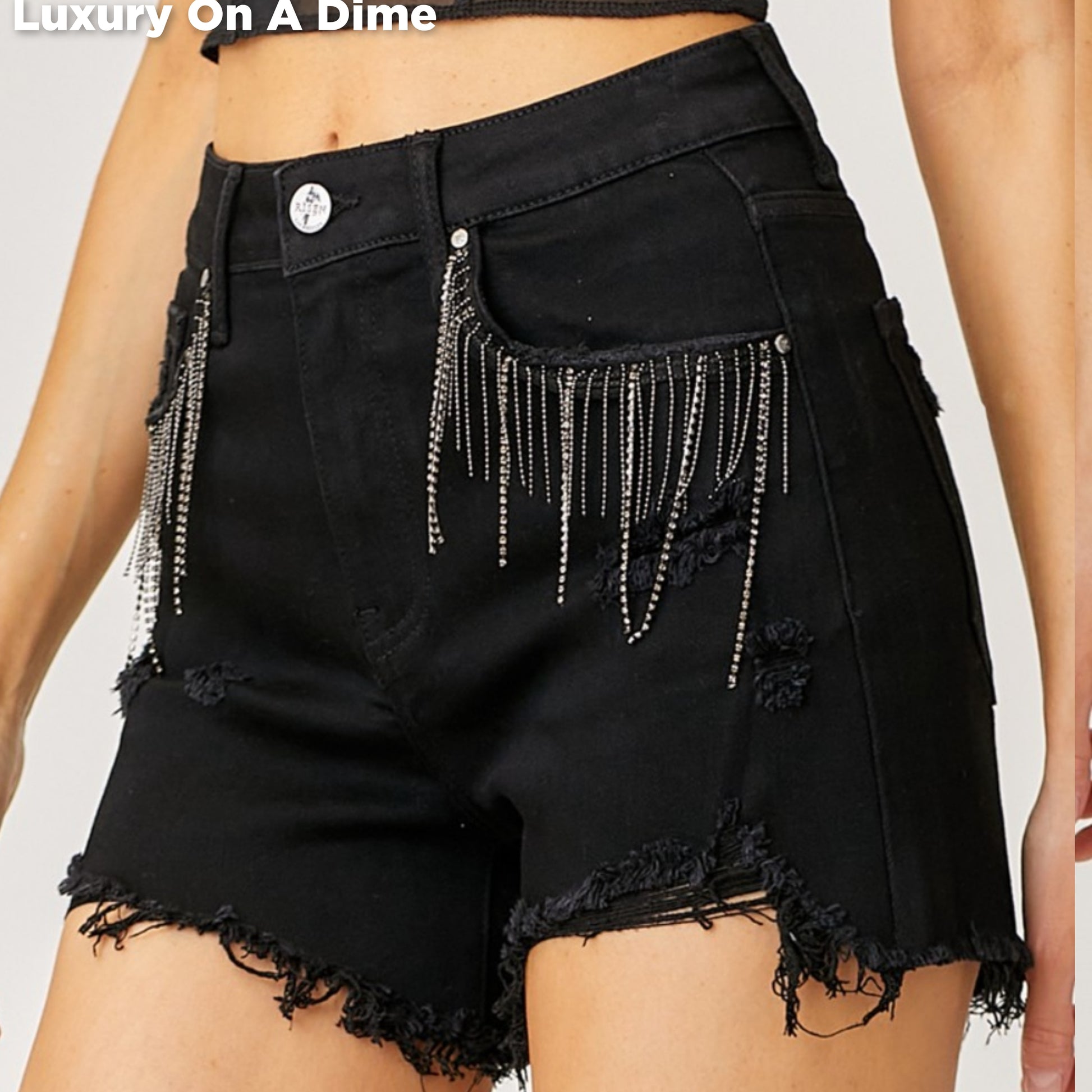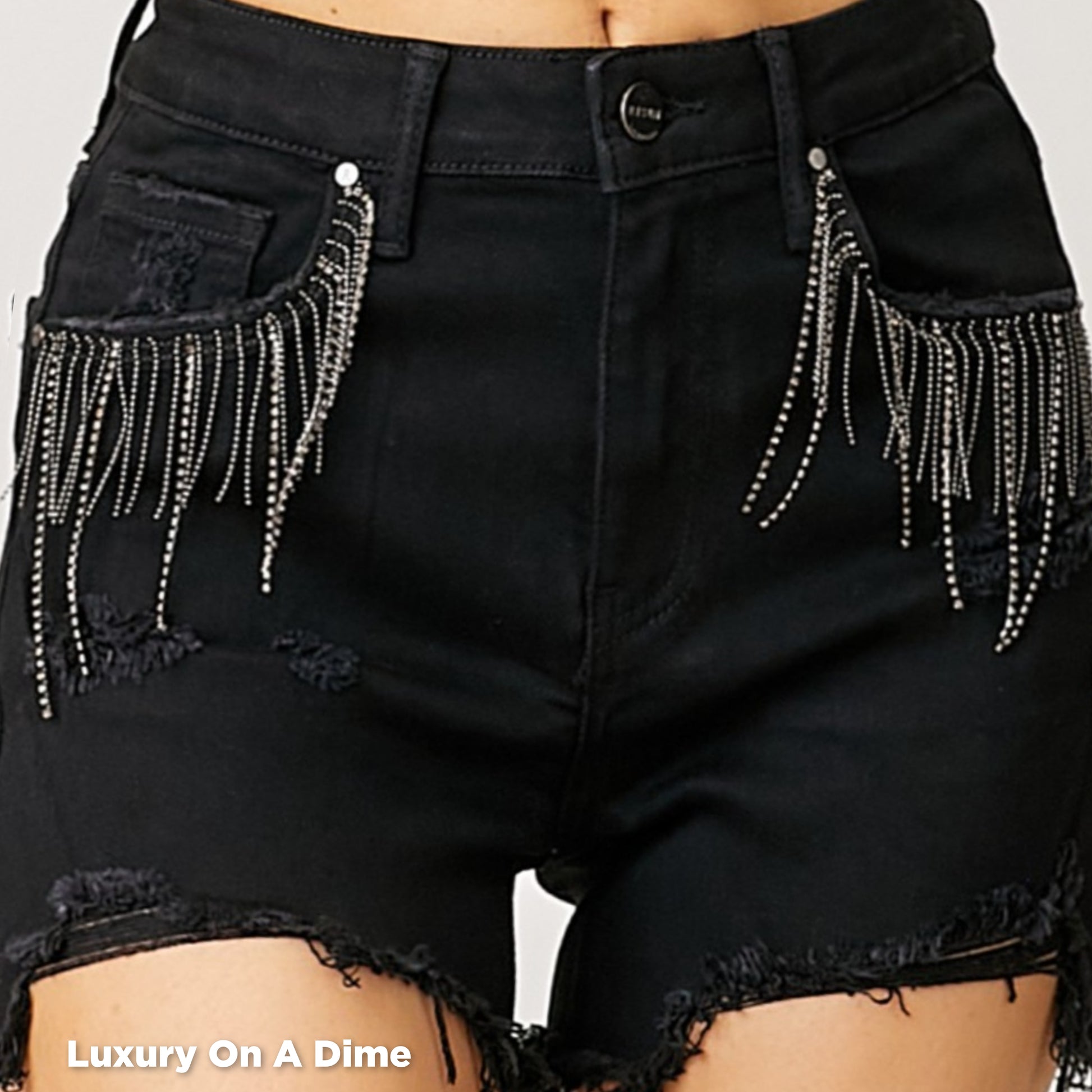 High-Rise Rhinestone Chain Fringe Distressed Jean Torn Cut-Off Denim RISEN Shorts