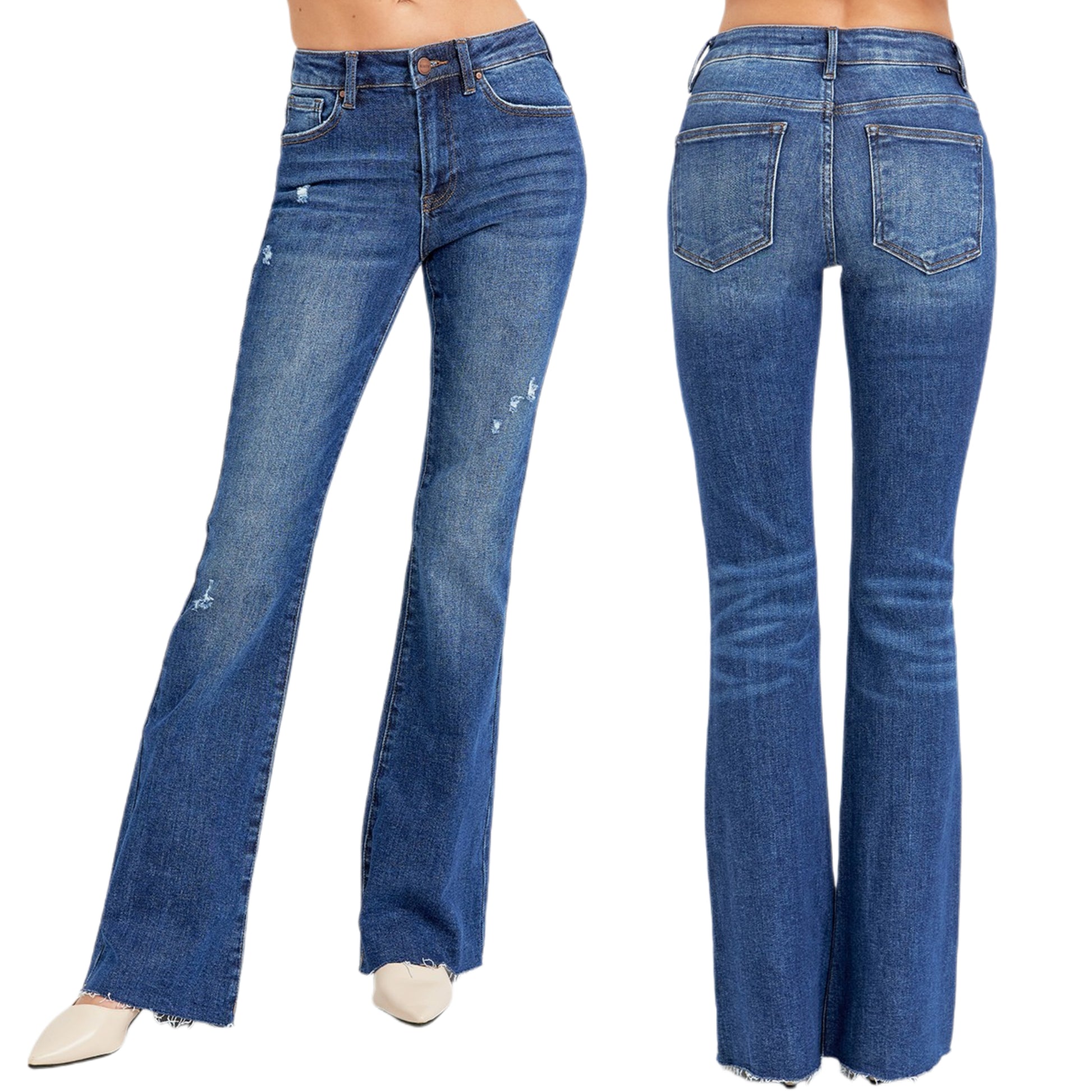 RISEN Mid-Rise Jeans Slim Fit Flare Leg Distressed Frayed Raw Hem Denim Pants Plus Size Available