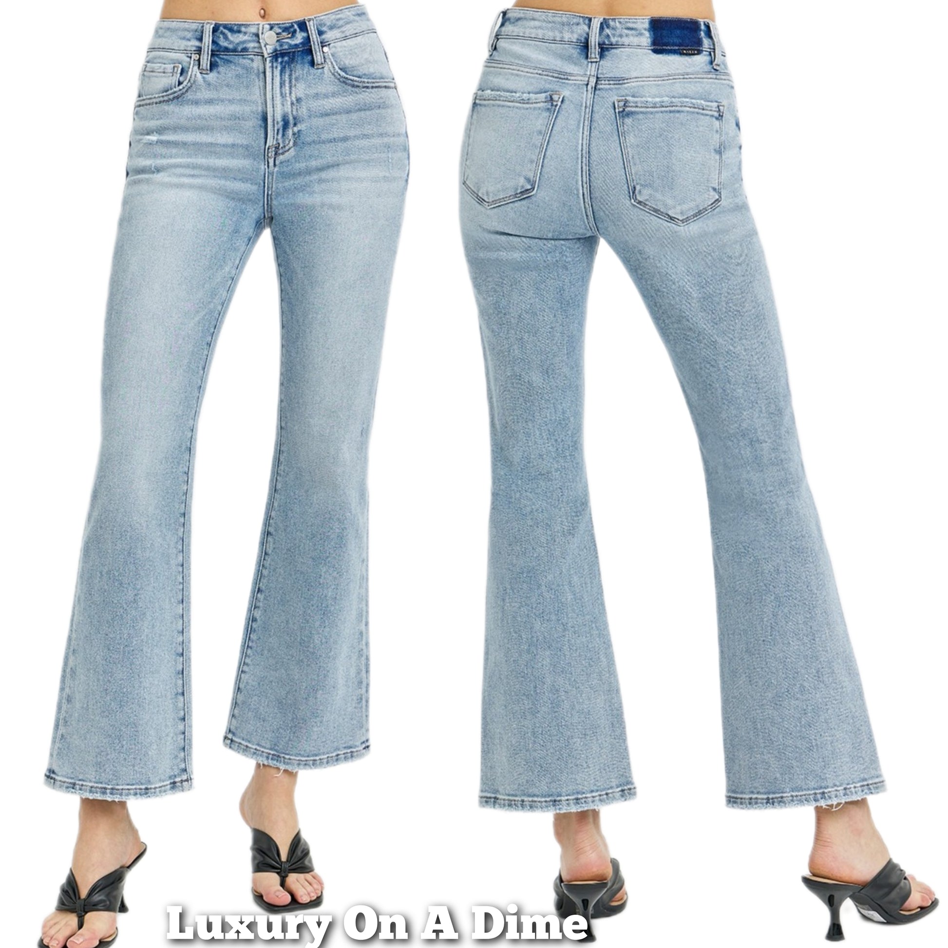 RISEN High-Rise Waist Slim Pants Wide Ankle Flare Hem Retro Denim Blue Jeans
