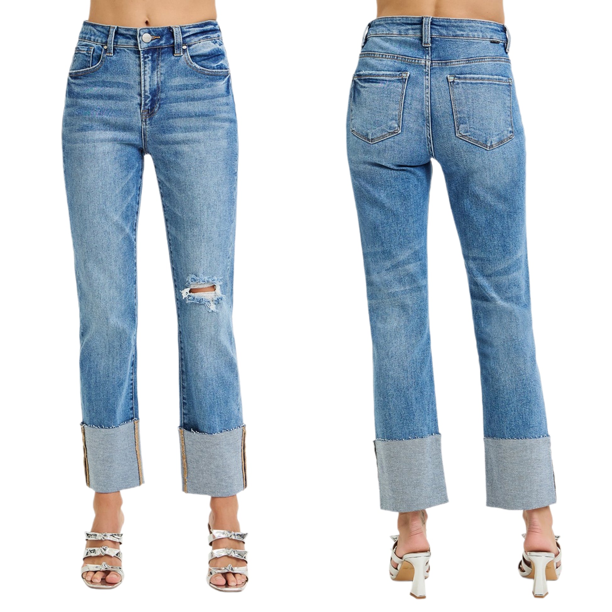 RISEN High-Rise Straight Leg Ankle Jeans Wide Cuffed Hem Distressed Denim Pants