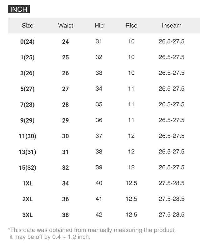 | Size | Waist | Hip | Rise | Inseam | Bottom Length |