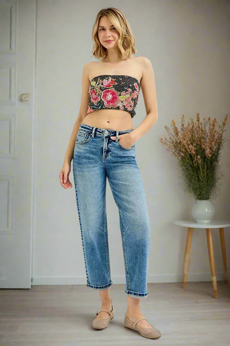 RISEN High-Rise Boyfriend Fit Jeans Ankle Cuffed Straight Leg Cropped Denim Pants