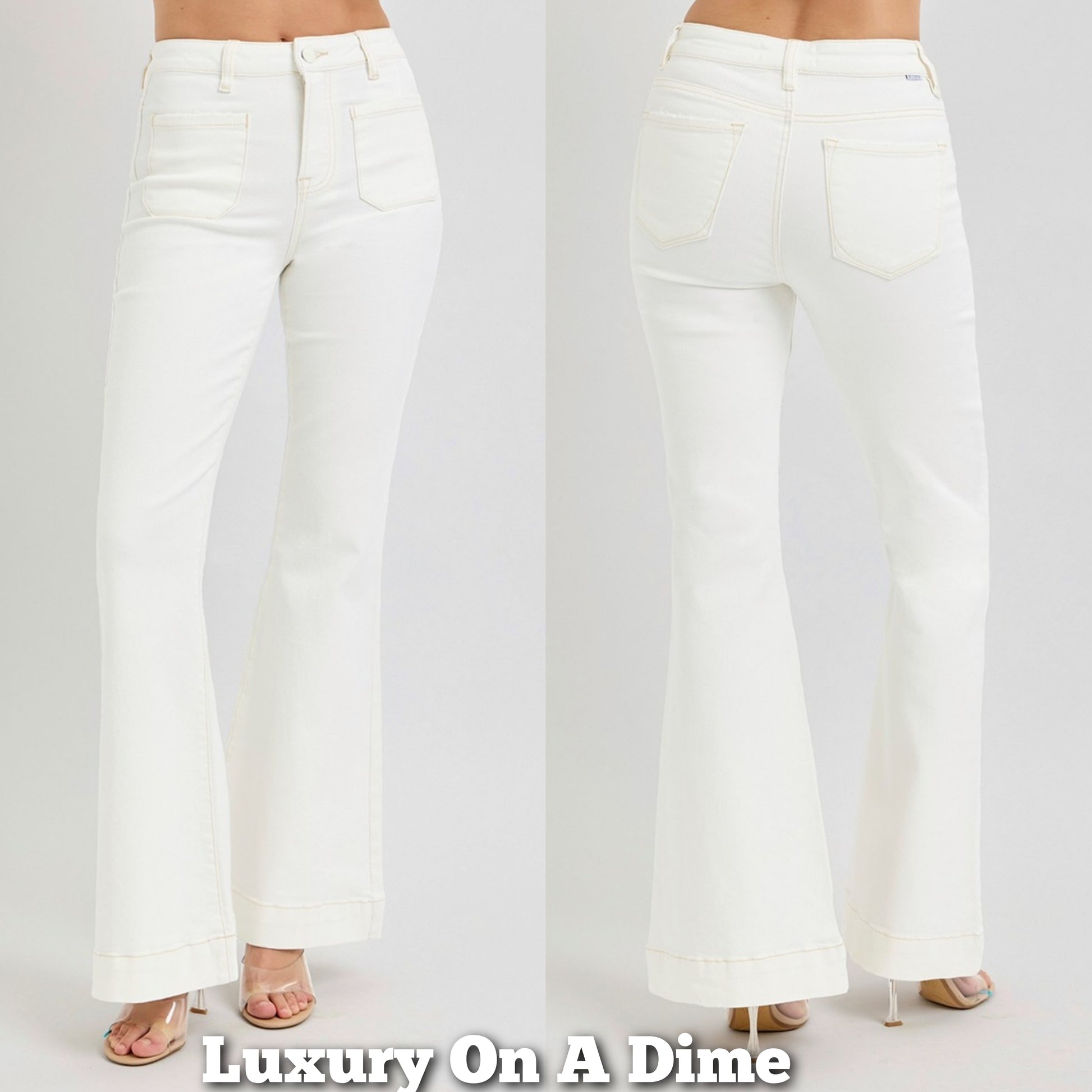 RISEN Flare High-Rise Slim Pants Tapered Leg Denim Jeans Retro 90s Patch Pockets