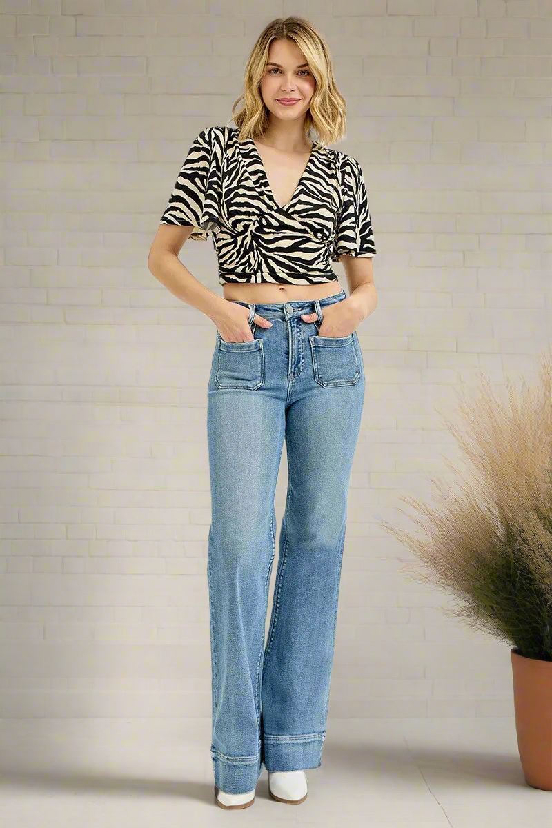 RISEN High-Rise Retro 70s Flare Leg Wide Released Hem Pants Slim Fit Denim Jeans Plus Size Available
