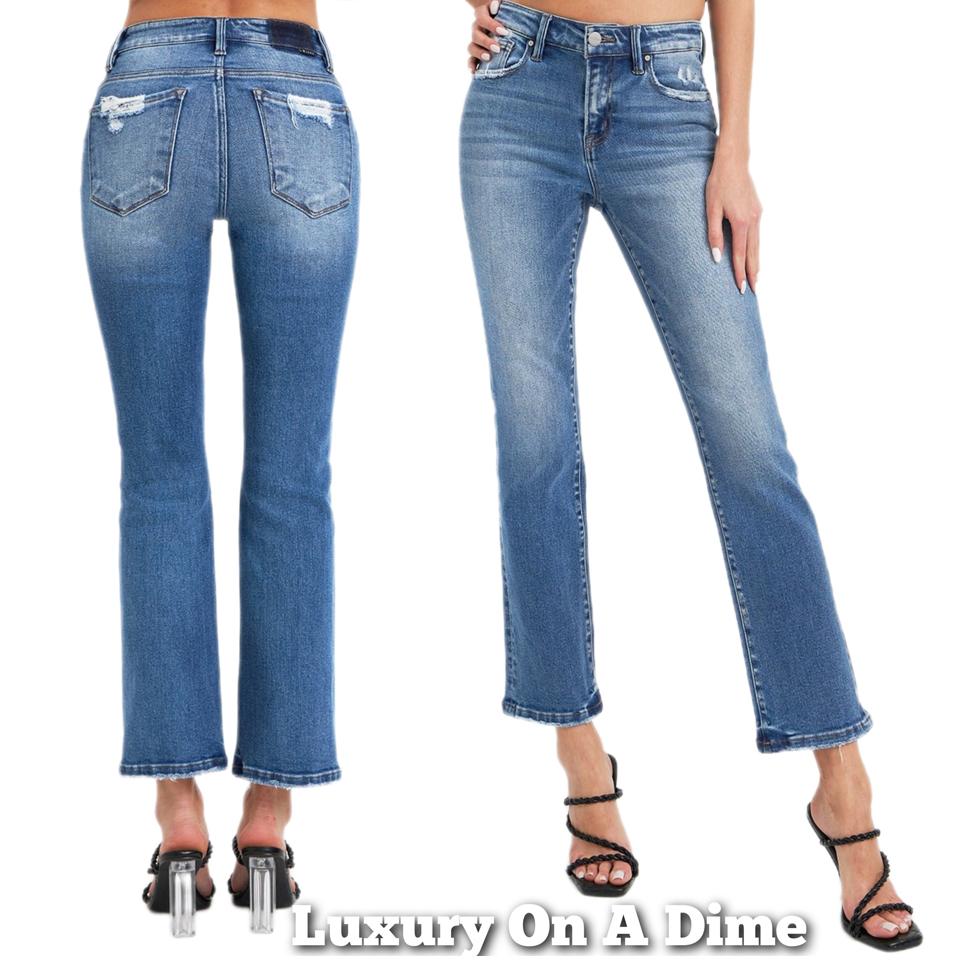 RISEN Mid-Rise Straight Leg Ankle Boyfriend Jeans Distressed Torn Denim Pants