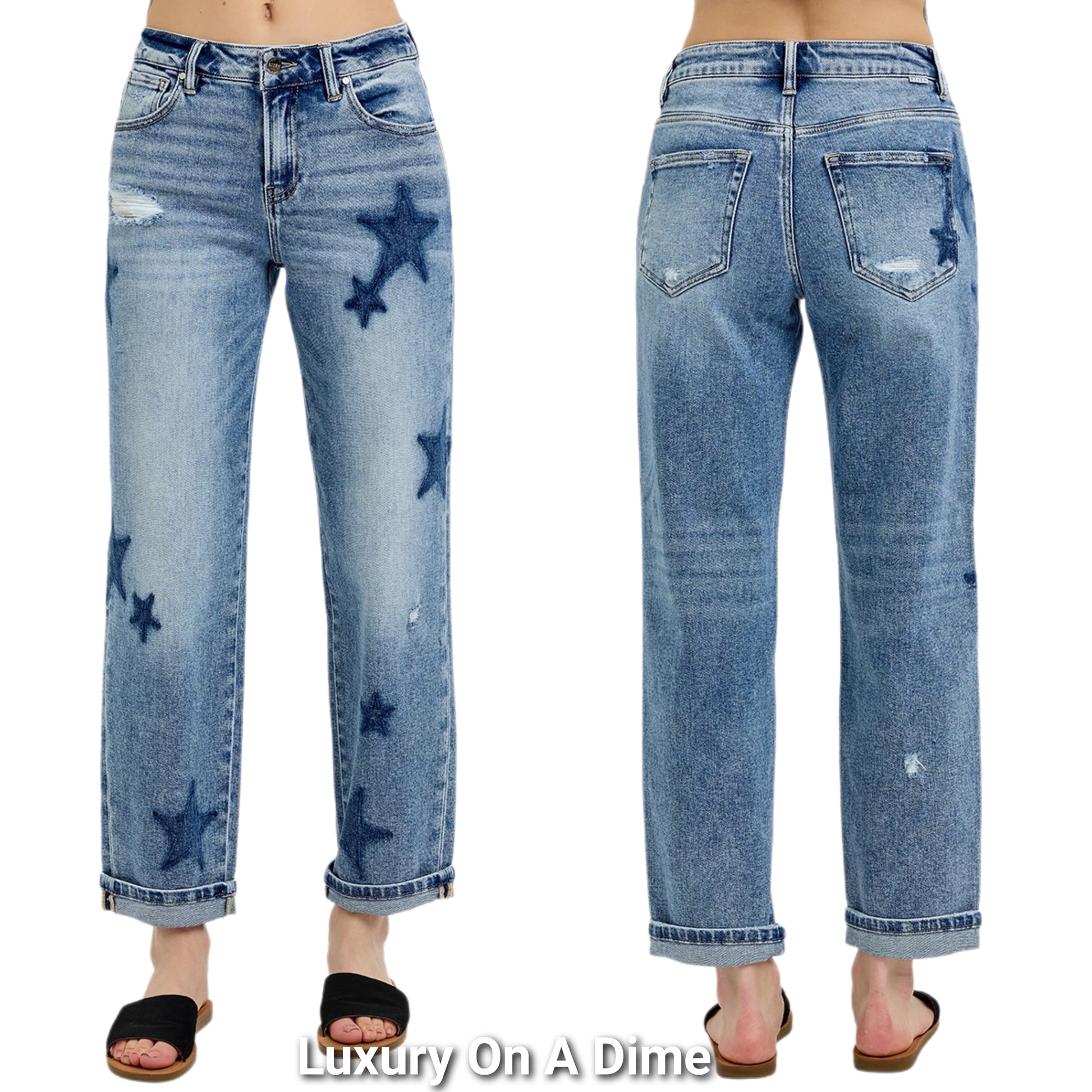 RISEN Dark Star Mid-Rise Boyfriend Fit Cuffed Cropped Pants Straight Leg Denim Jeans Plus Size Available
