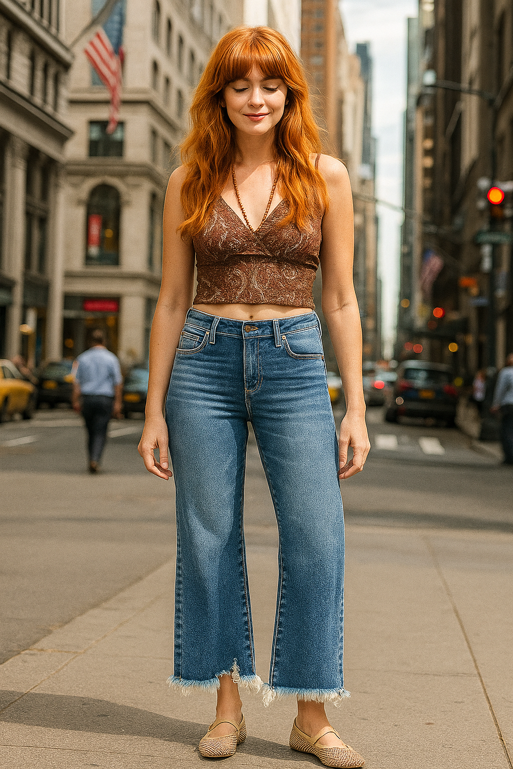 - Features: Frayed hem