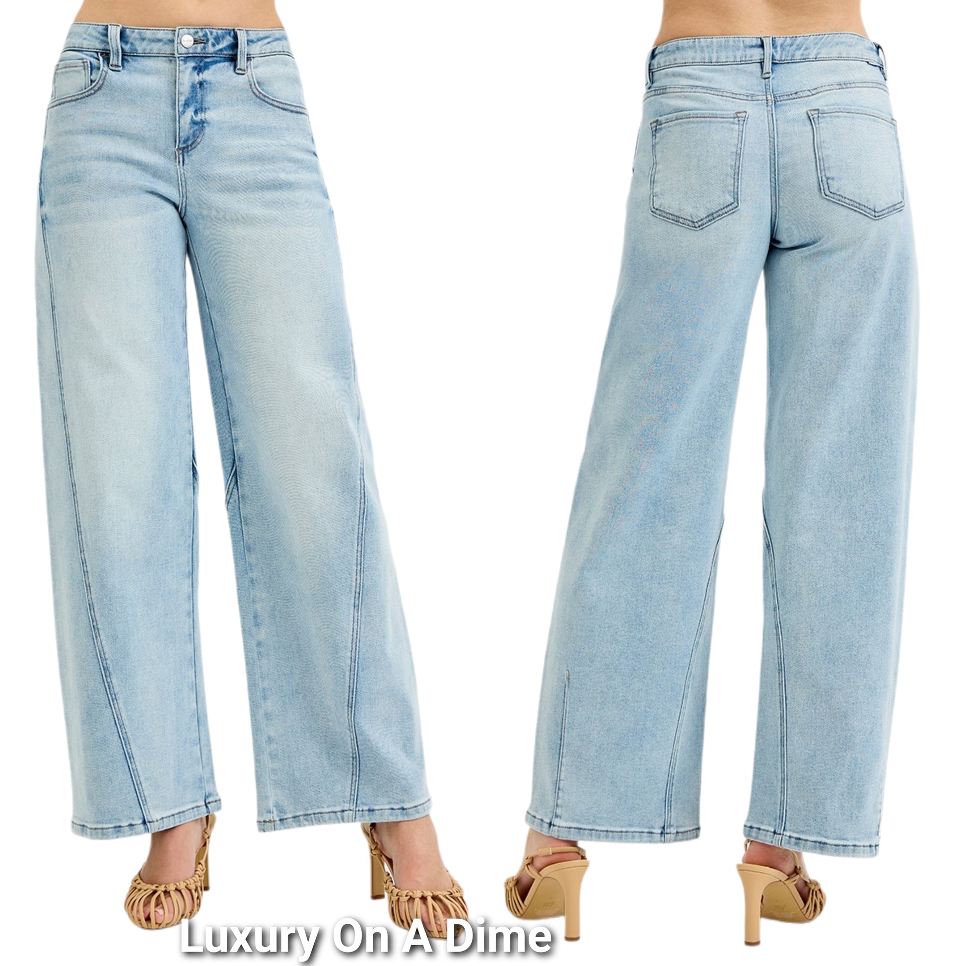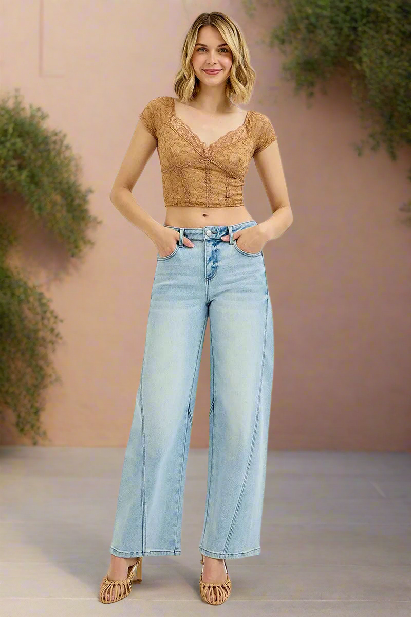 RISEN Baggy Barrel Wide Leg Jeans Mid-Rise Curved Seam Boyfriend Denim Pants