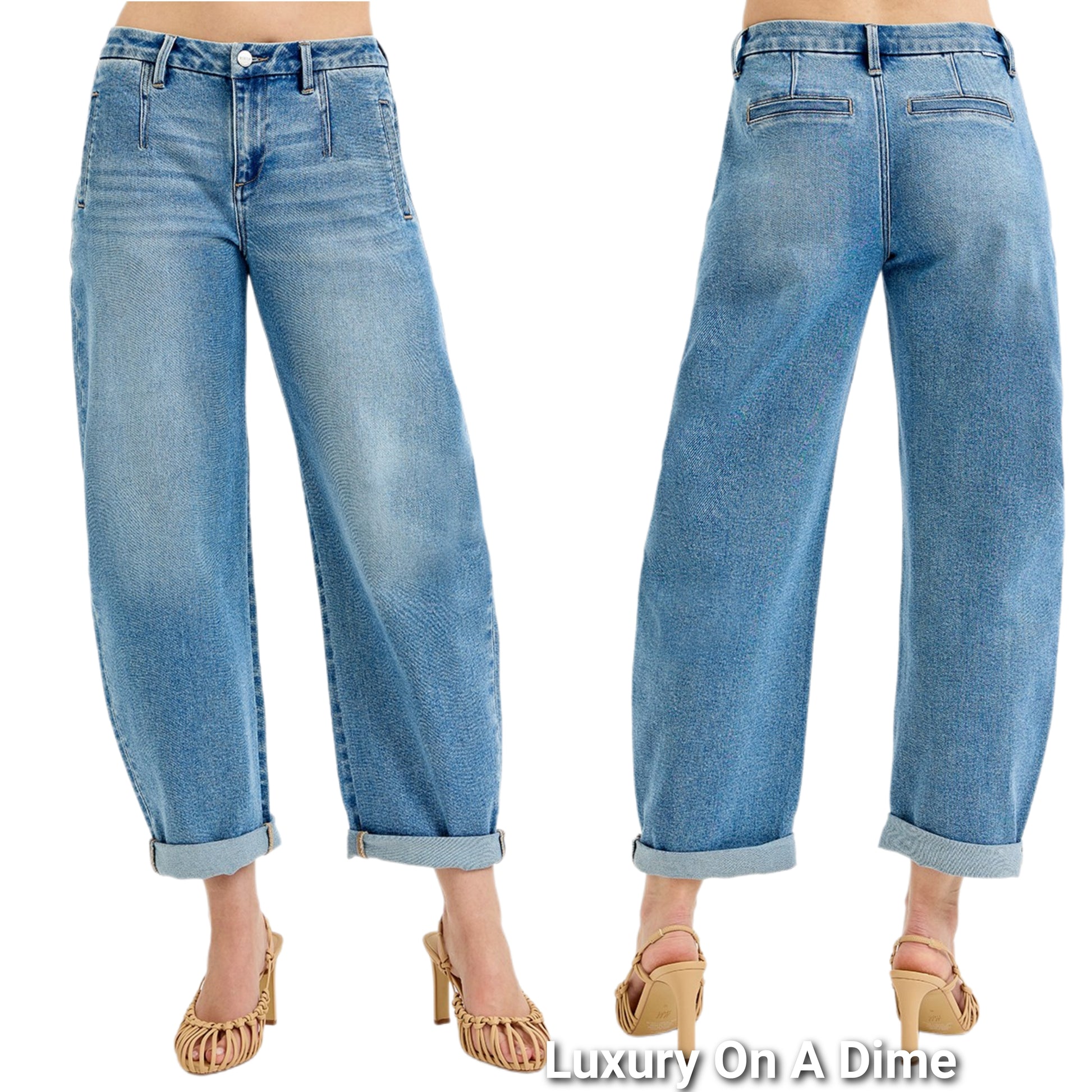 RISEN Mid-Rise Barrel Jeans Baggy Palazzo Tapered Leg Rolled Hem Denim Pants Plus Size Available