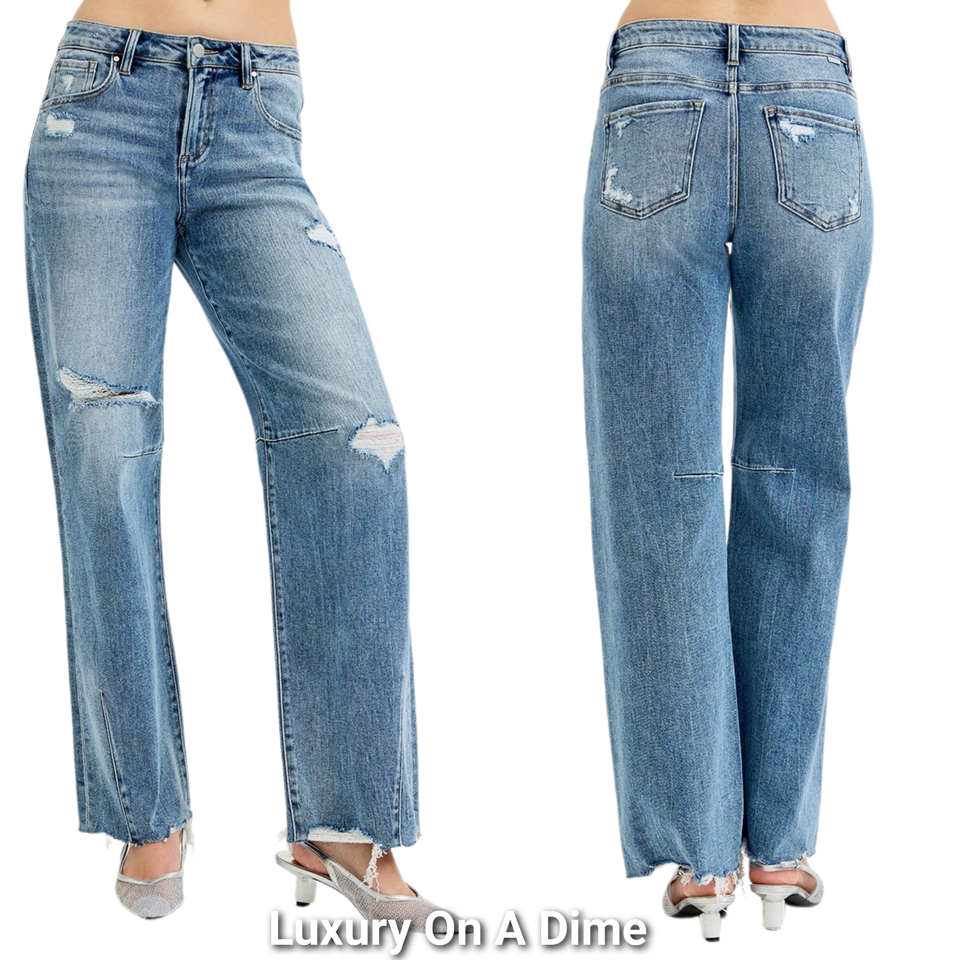 RISEN Baggy Mid-Rise Pleated Wide Leg Distressed Torn Boyfriend Fit Denim Jeans Plus Size Available
