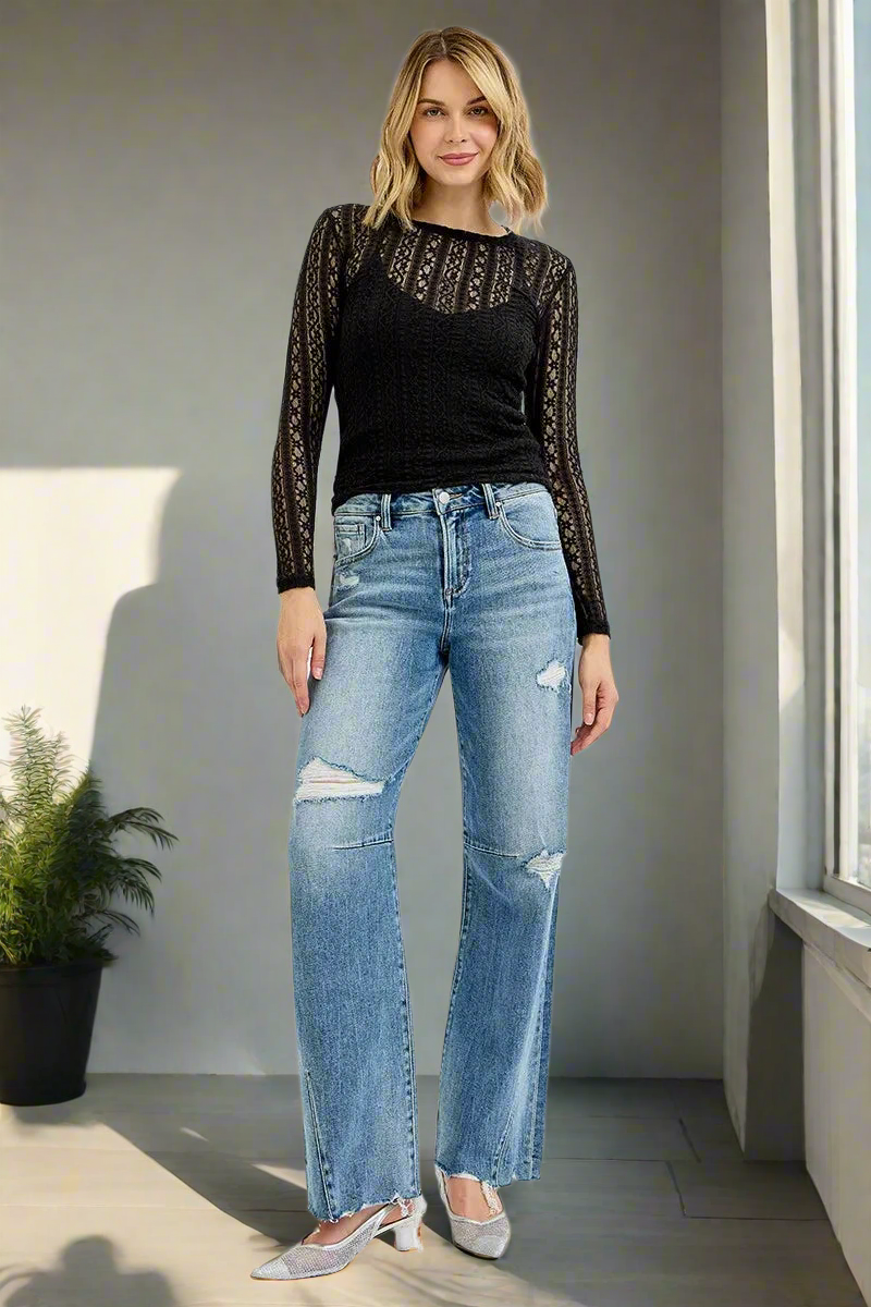 RISEN Baggy Mid-Rise Pleated Wide Leg Distressed Torn Boyfriend Fit Denim Jeans