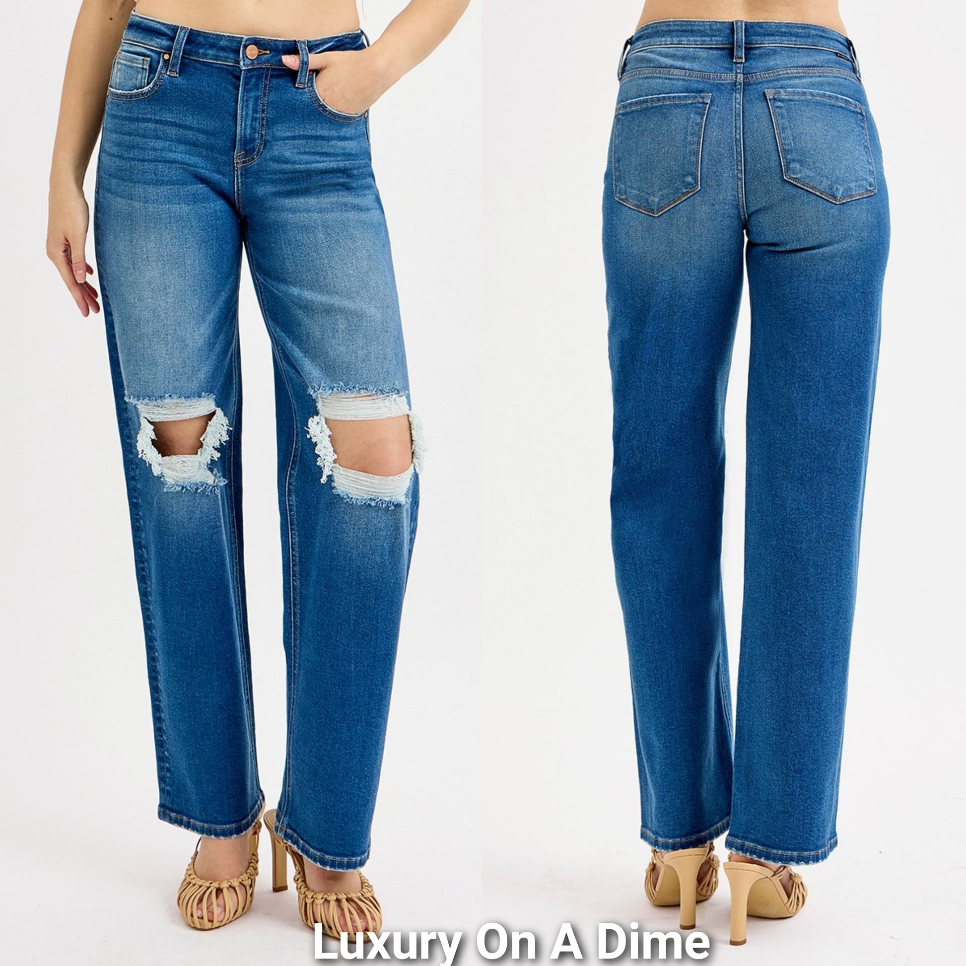 RISEN Mid-Rise Boyfriend Distressed Torn Knee Hole Jeans Straight Leg Denim Pants