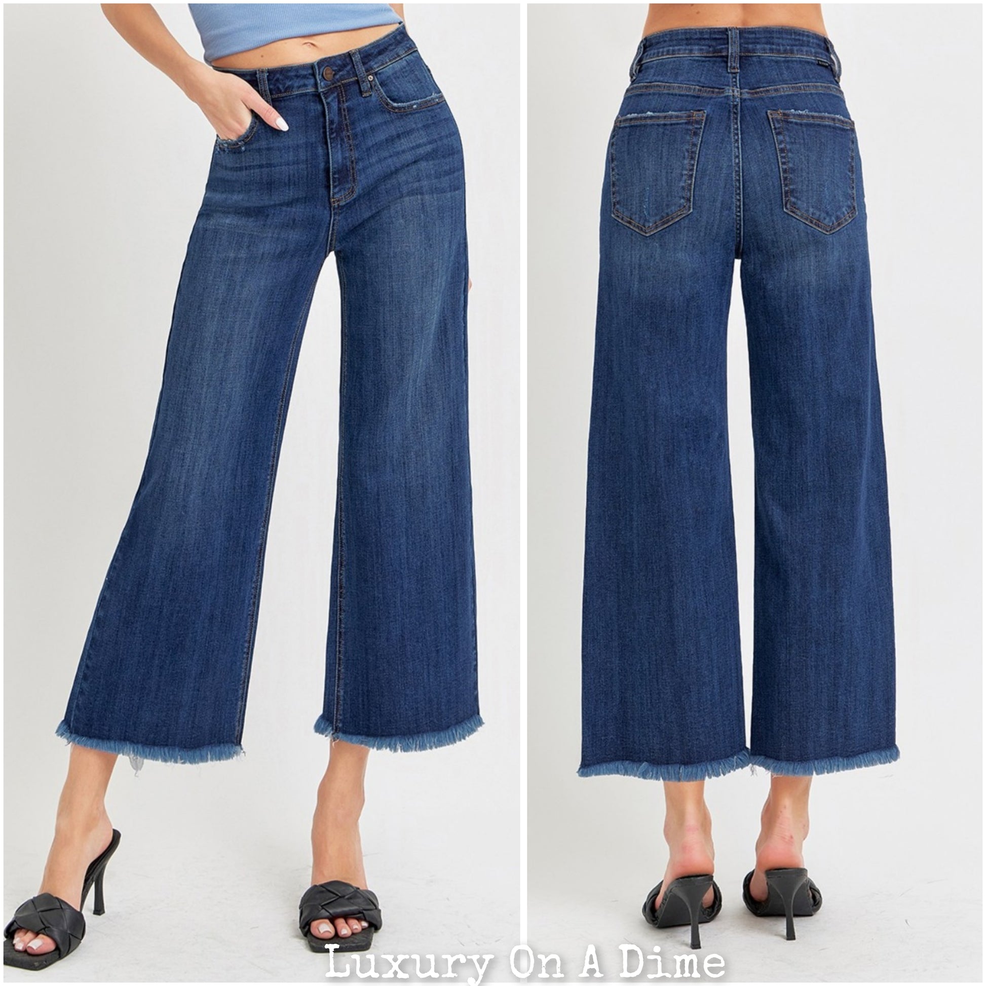High-Rise Denim Jeans Wide Leg Cropped Raw Frayed Hem Retro Pants RISEN