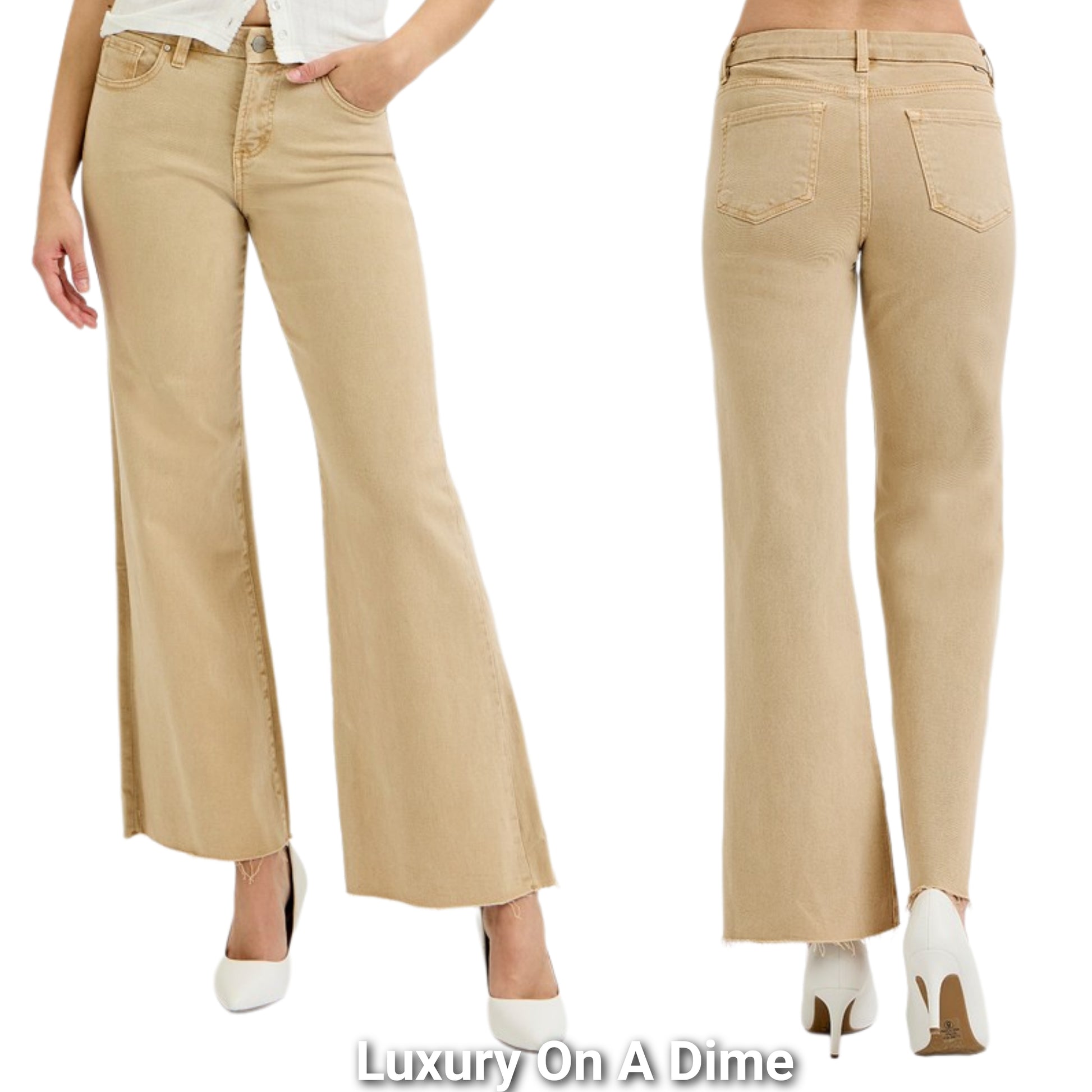 RISEN Low-Rise Retro 70s Wide Leg Pants Cut-off Frayed Raw Hem Khaki Denim Jeans Plus Size Available