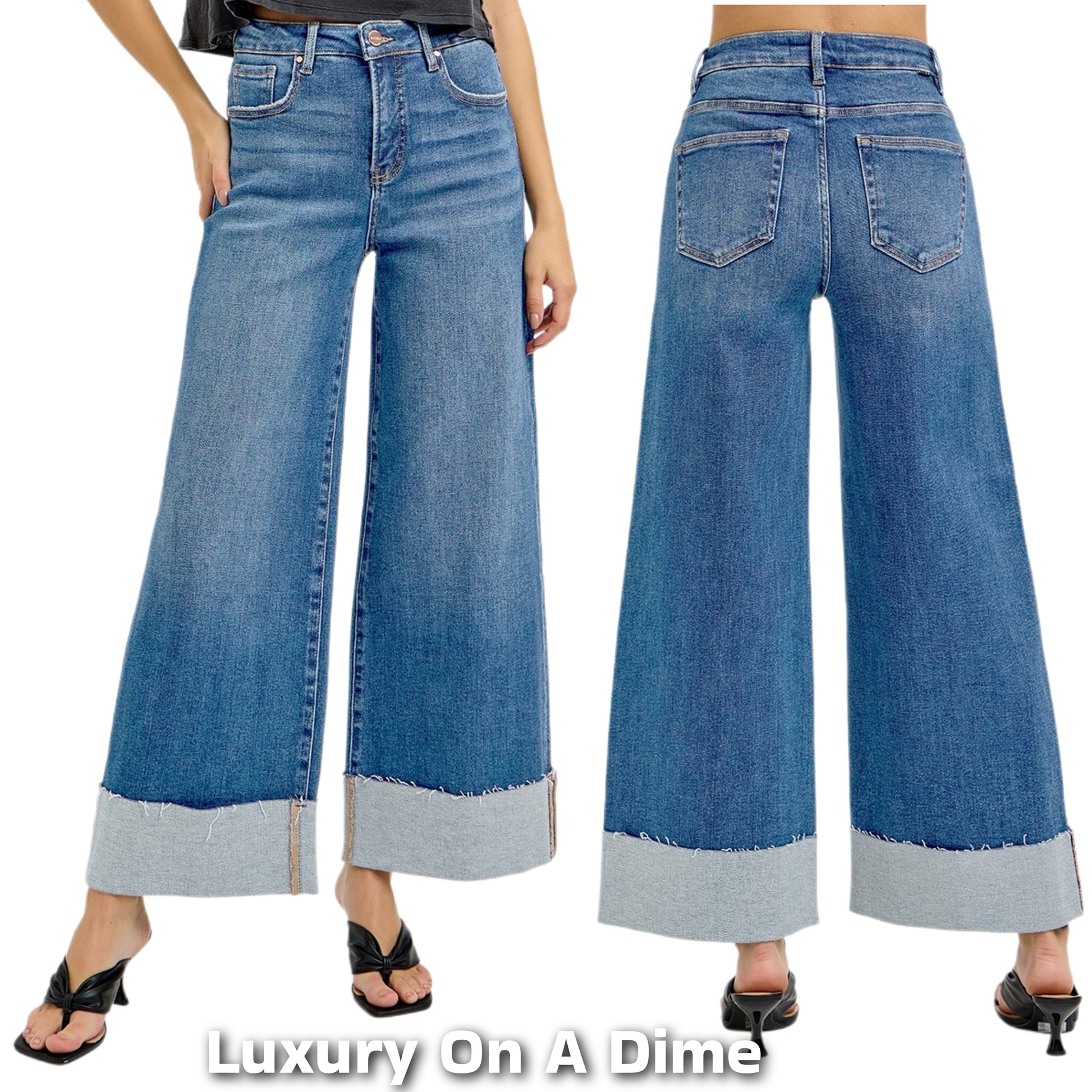 RISEN High-Rise Tummy Control Pants Baggy Wide Leg Crop Cuffed Hem Denim Jeans