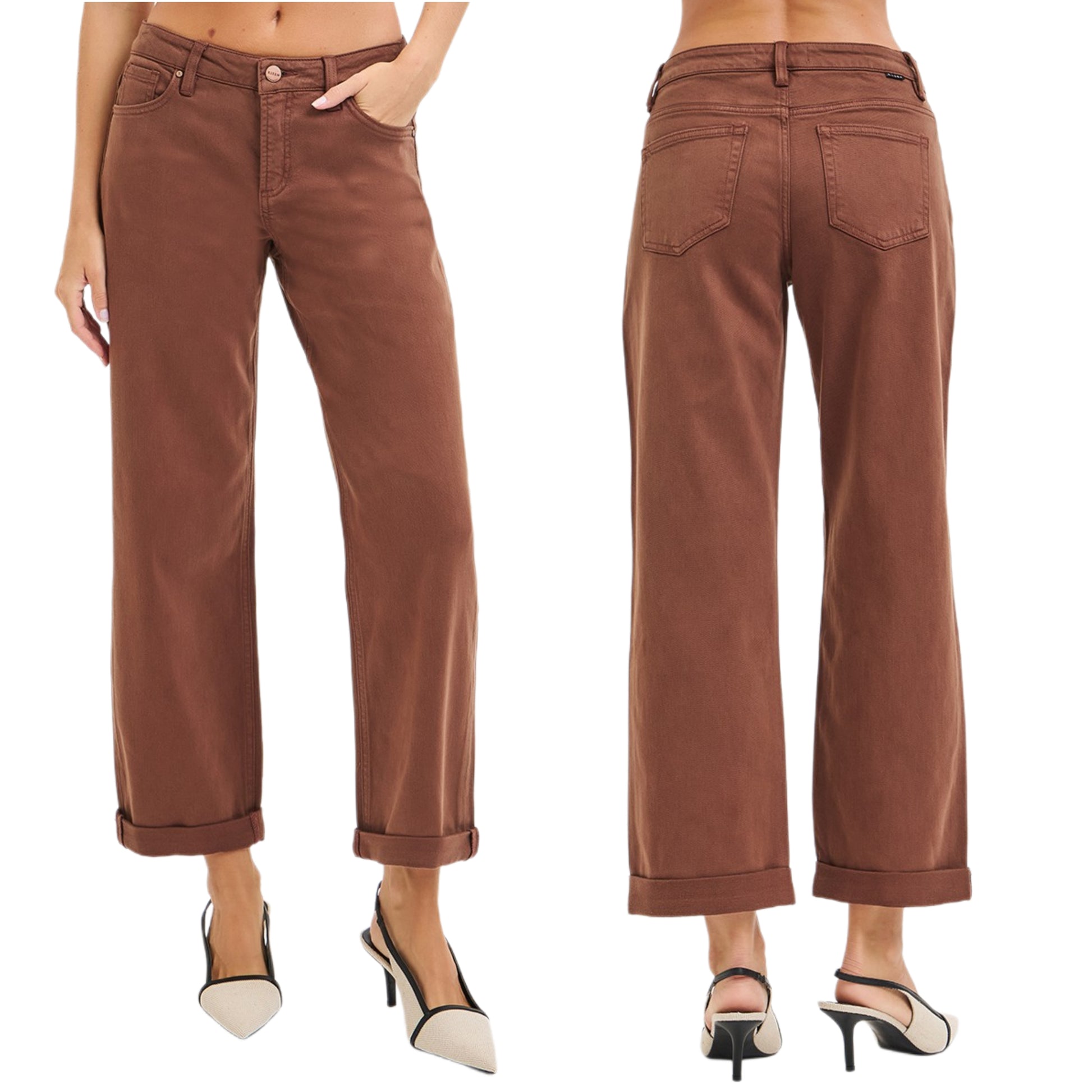 RISEN Mid-Rise Tummy Control Barrel Jeans Baggy Leg Rolled Hem Denim Pants