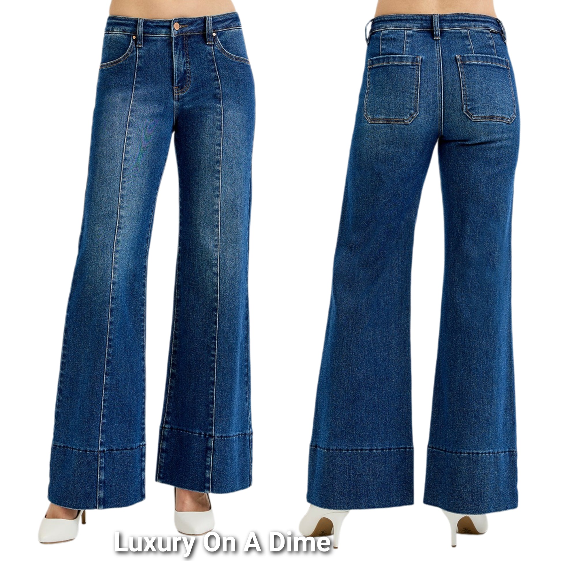 RISEN Mid-Rise Tummy Control Pants Vertical Seam Wide Flare Leg 70s Denim Jeans Plus Size Available