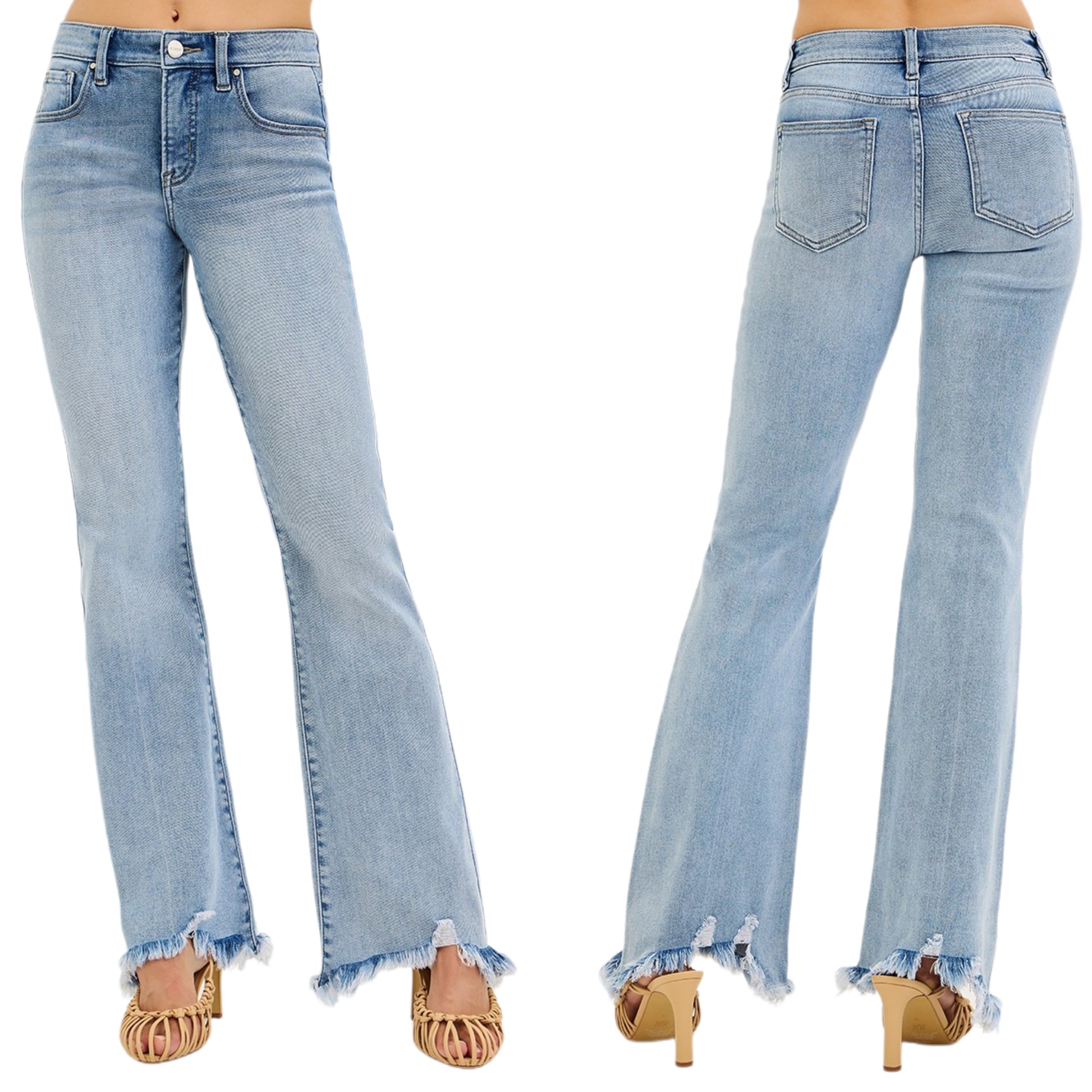 RISEN Mid-Rise Tummy Control Jeans Slim Flare Leg Raw Frayed Hem Denim Pants