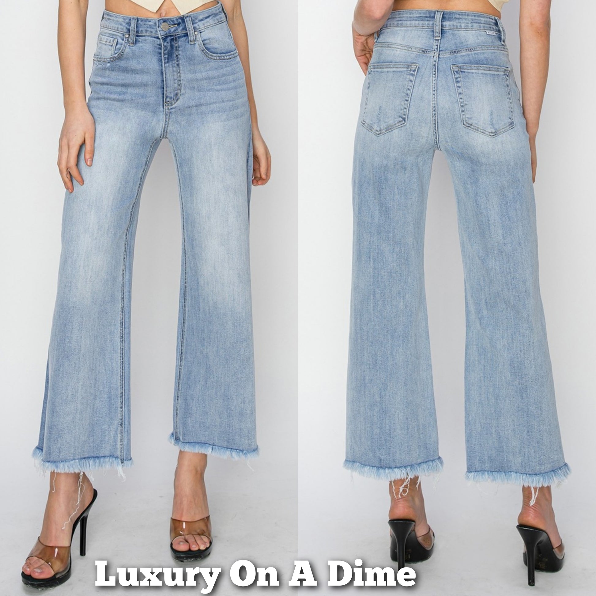 RISEN High-Rise Waist Pants Wide Leg Cropped Raw Frayed Hem Denim Jeans