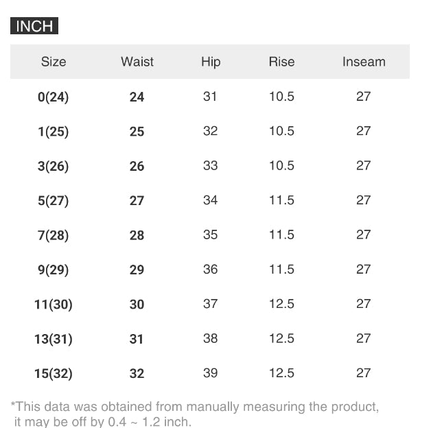 | Size | Waist | Hip | Rise | Inseam |