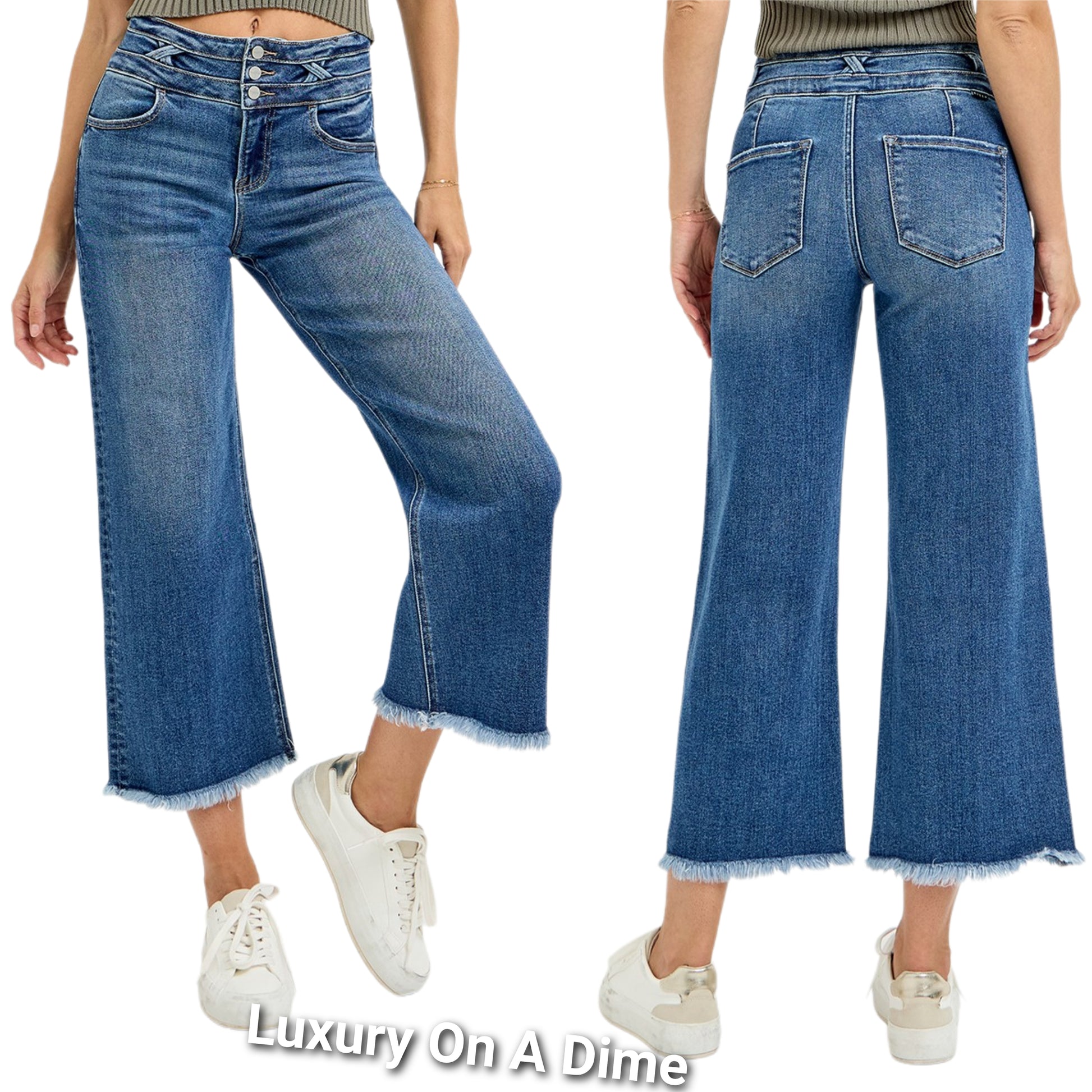 RISEN High-Rise Tripple Button Pants Baggy Wide Leg Cropped Raw Hem Denim Jeans