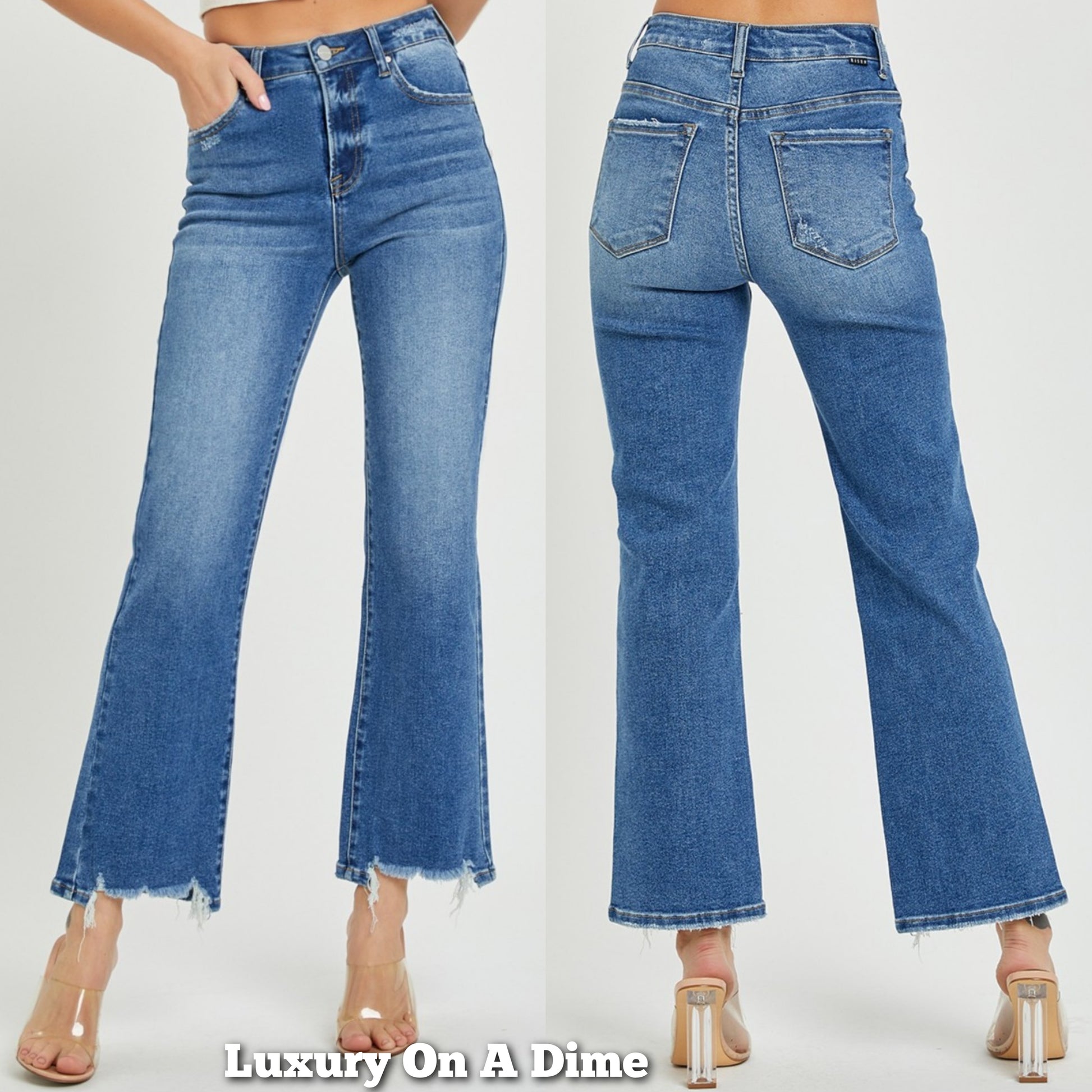 RISEN High-Rise Straight Leg Distressed Ankle Frayed Raw Hem Jeans Denim Pants