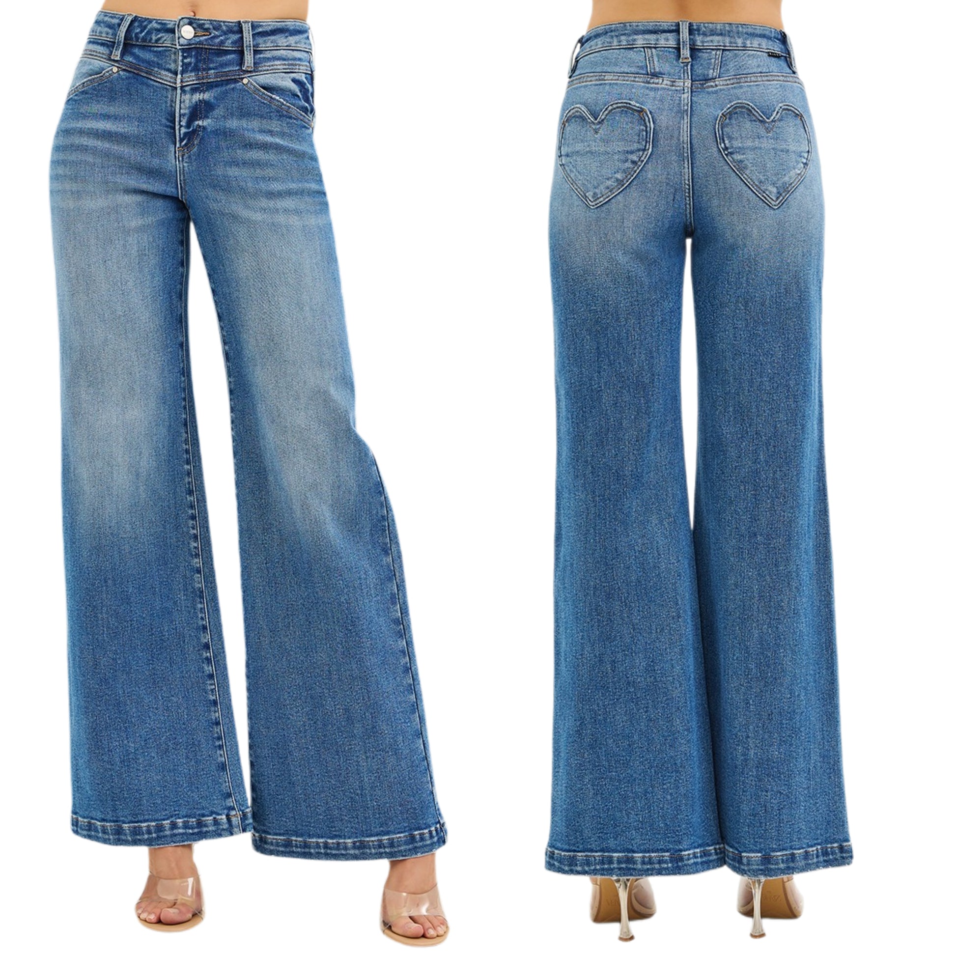 RISEN Heart Pocket High-Rise Wide Leg Jeans Yoke Waist Relaxed Fit Denim Pants