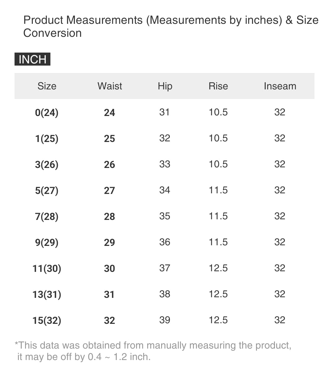 Size | Waist | Hip | Rise | Inseam |