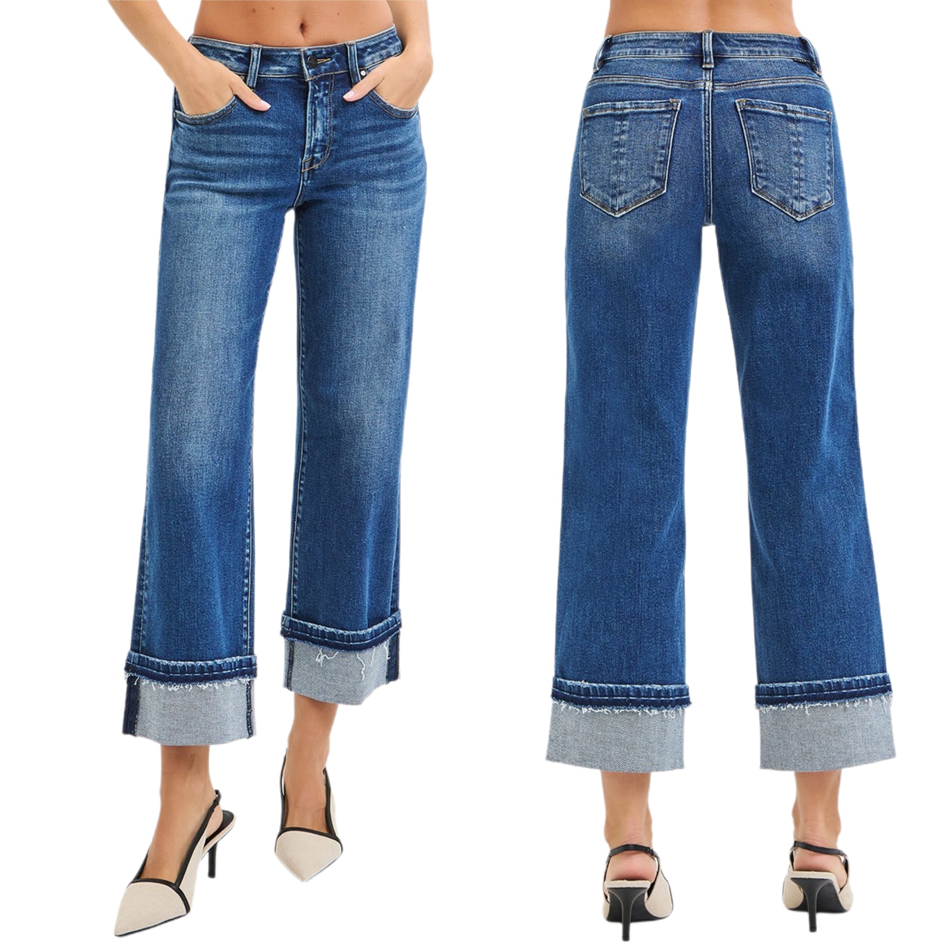 RISEN Mid-Rise Slim Fit Jeans Ankle Cuffed Raw Hem Straight Leg Denim Pants
