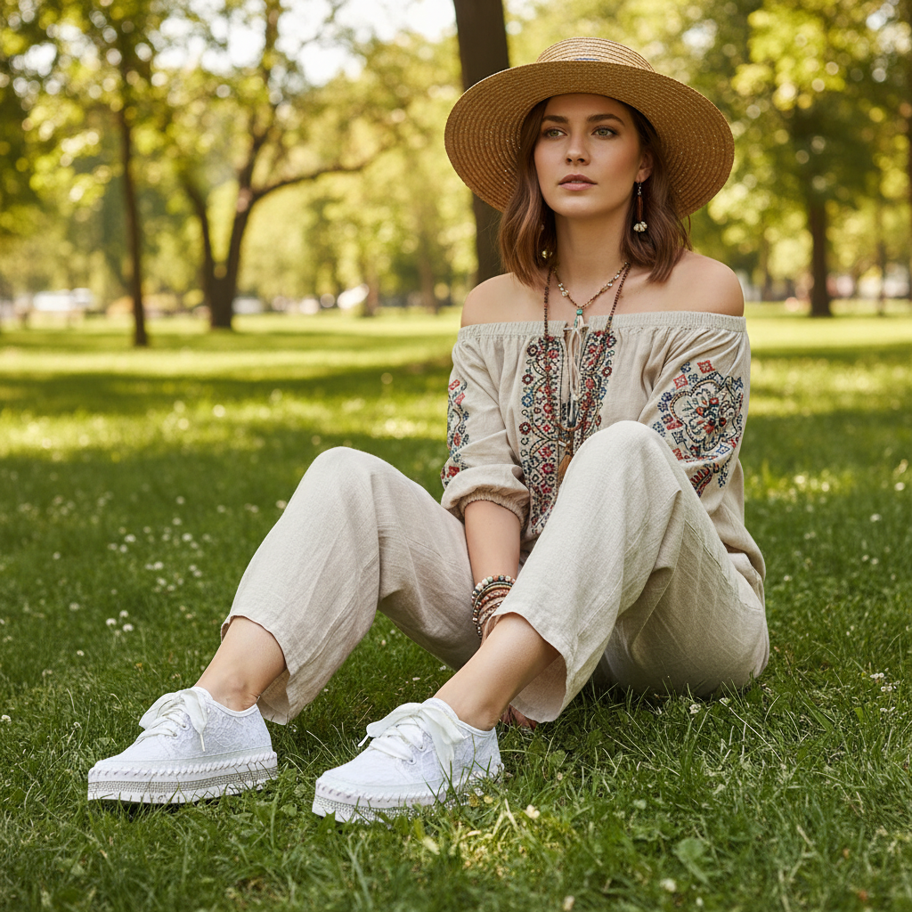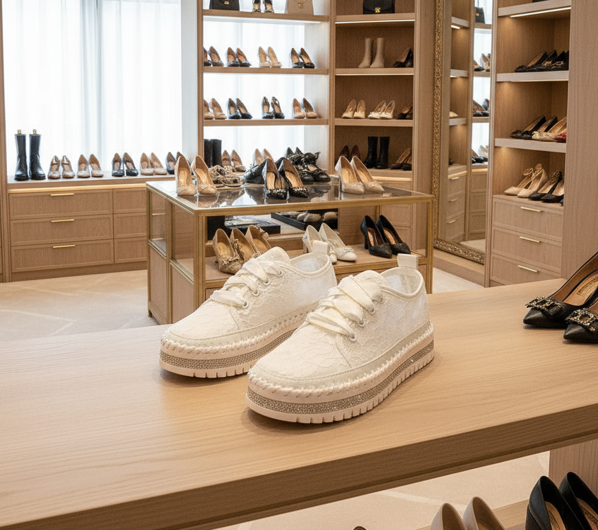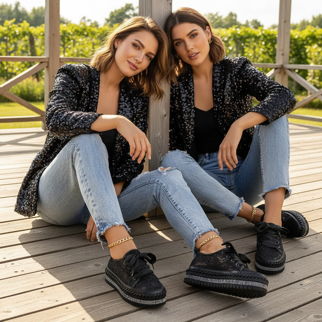 These lace platform sneakers embody the perfect fusion of coquette femininity, quiet luxury, and modern streetwear elegance. Crafted from delicate lace mesh with vegan PU leather trim and shimmering rhinestone accents, they blend soft glamour with bold confidence. The satin ribbon laces add a dreamy, romantic touch inspired by balletcore and soft girl aesthetics, while the rhinestone-studded platform brings in night luxe radiance and Y2K sparkle. Balancing ethereal romance and urban chic, these sneakers channel the energy of Parisian charm, romantic minimalism, and elevated casual fashion. Designed for both comfort and statement appeal, they capture a sense of effortless refinement, vintage allure, and playful sophistication, a modern take on girl-next-door element with a whimsical twist.