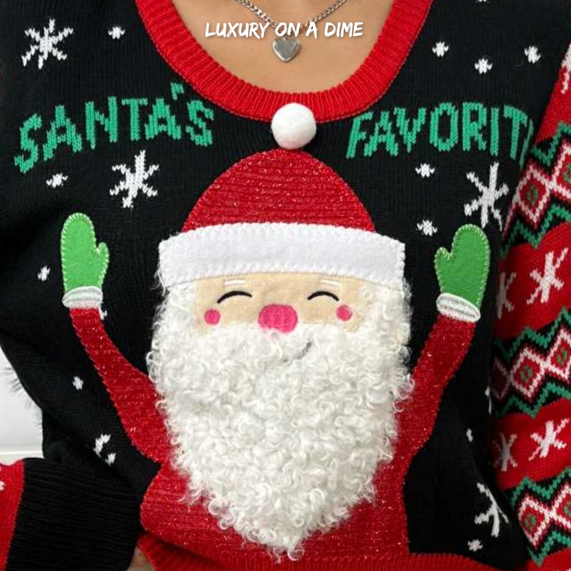 Santa's Favorite Knit Fun Fuzzy Beard Fair Isle Long Sleeve Holiday Sweater Top