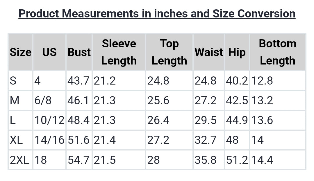 | Size | US | Bust | Sleeve Length | Top Length | Waist | Hip | Bottom Length |