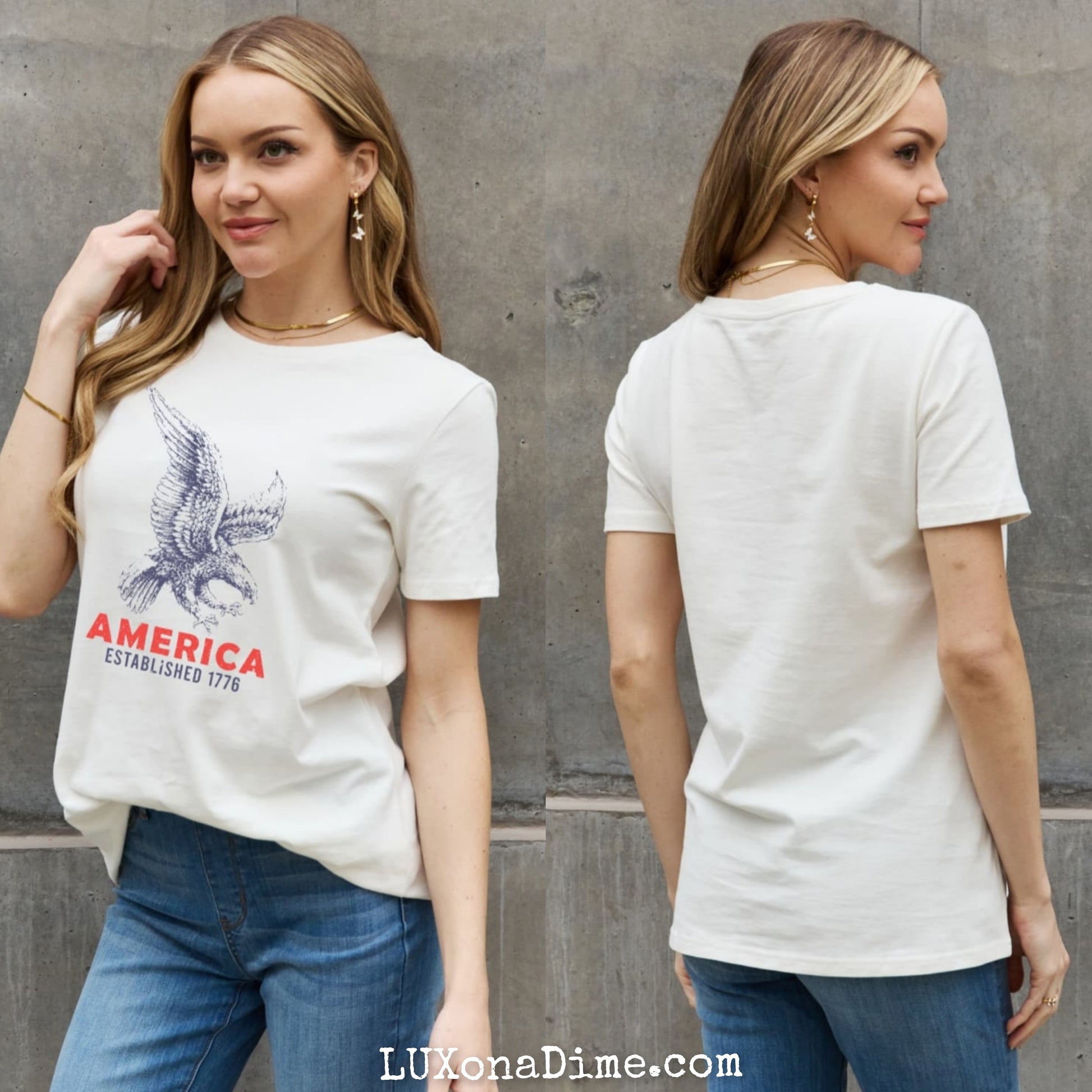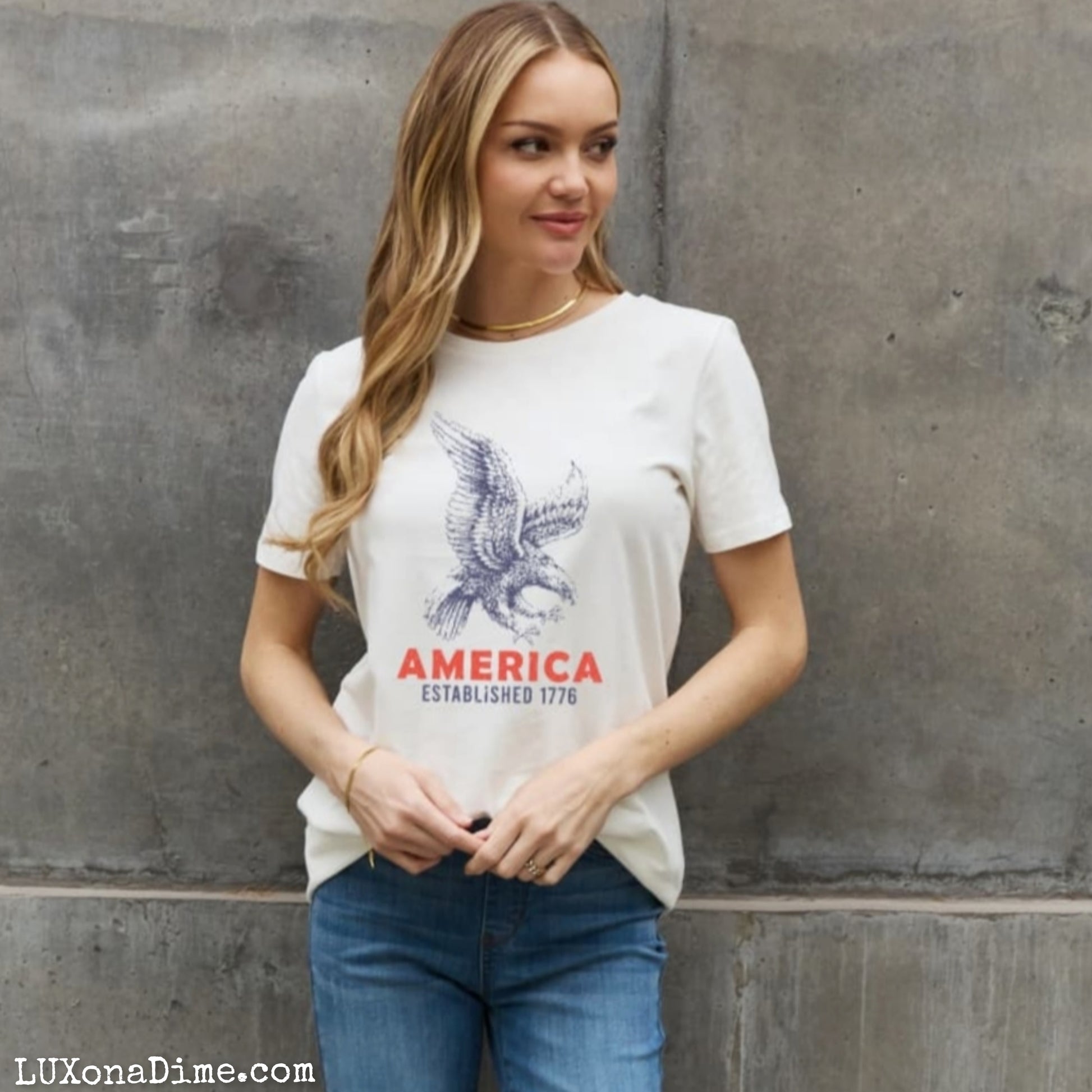AMERICA ESTABLISHED 1776 on a solid white top featuring an American eagle graphic in large print.