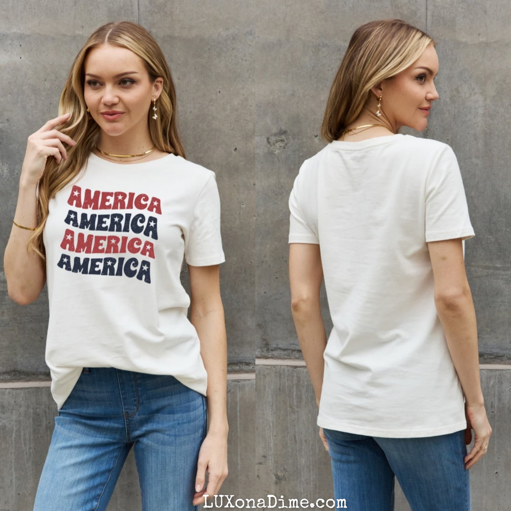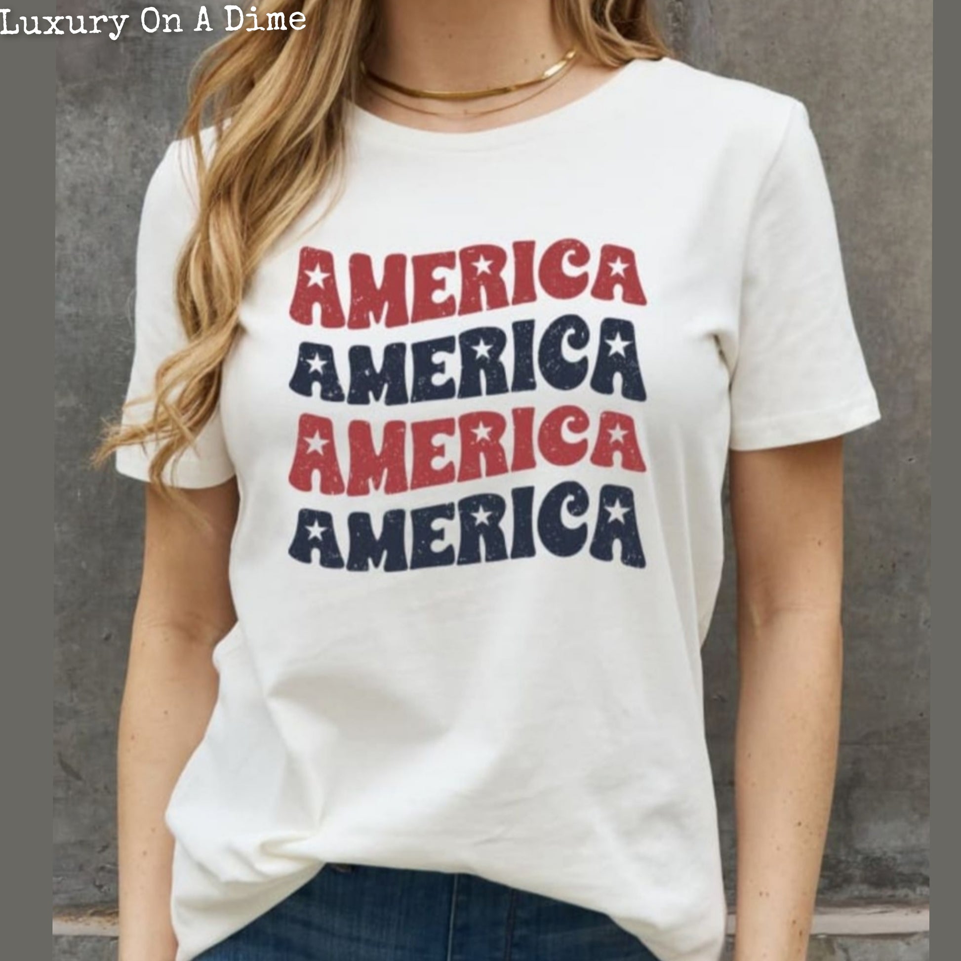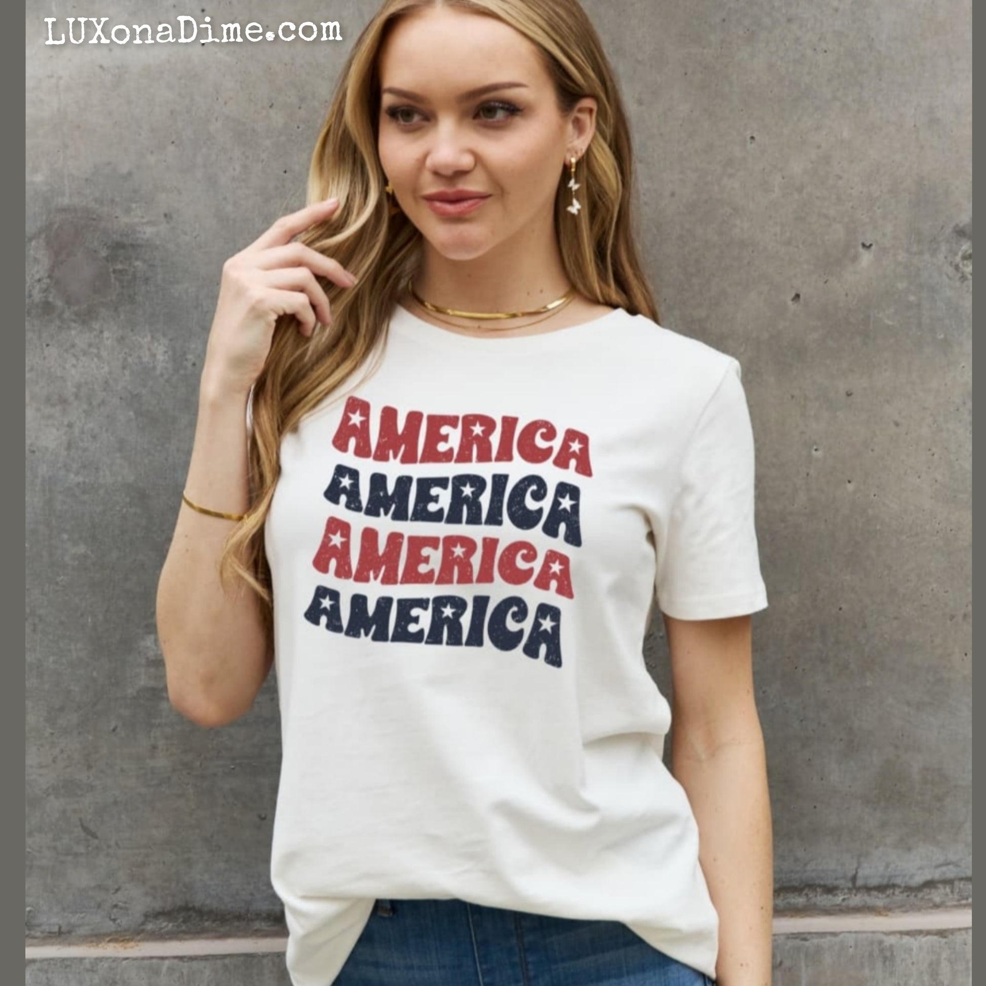 Solid white top with red and blue AMERICA wavy graphic in large print on the front.