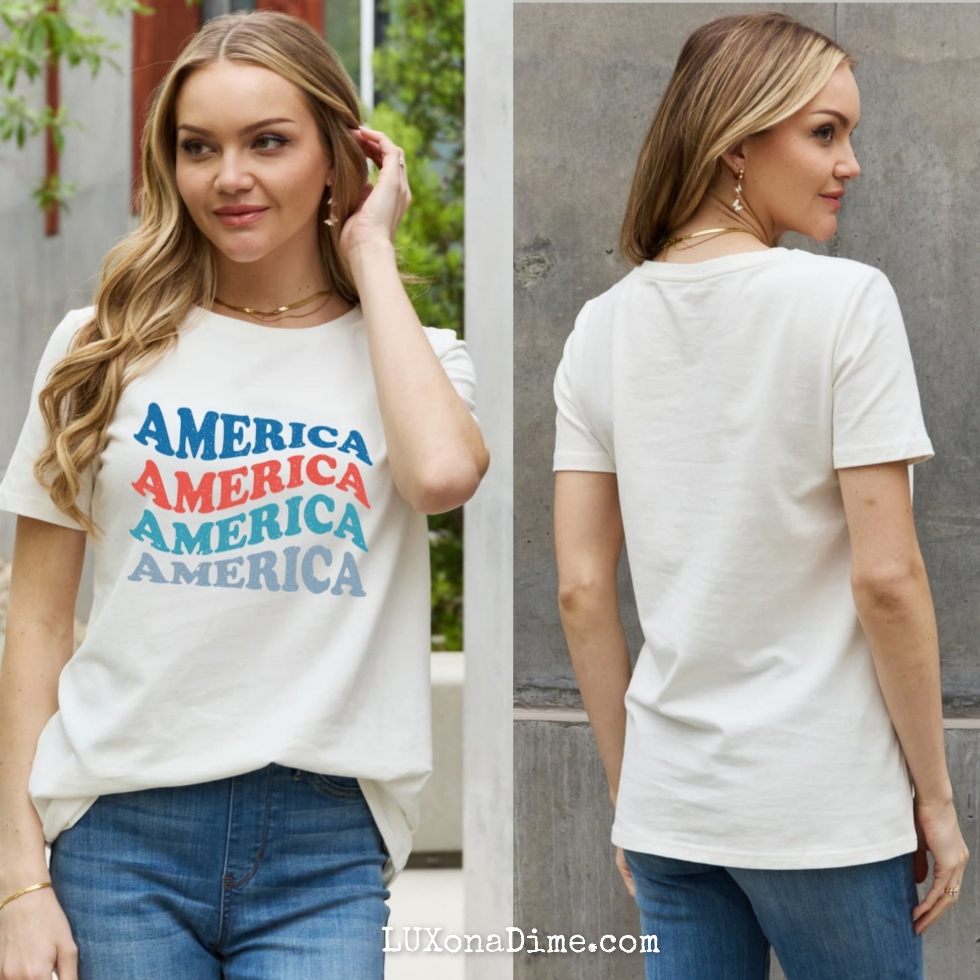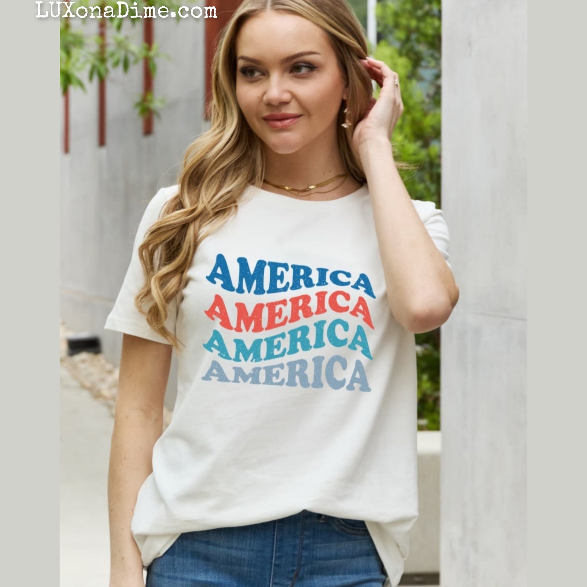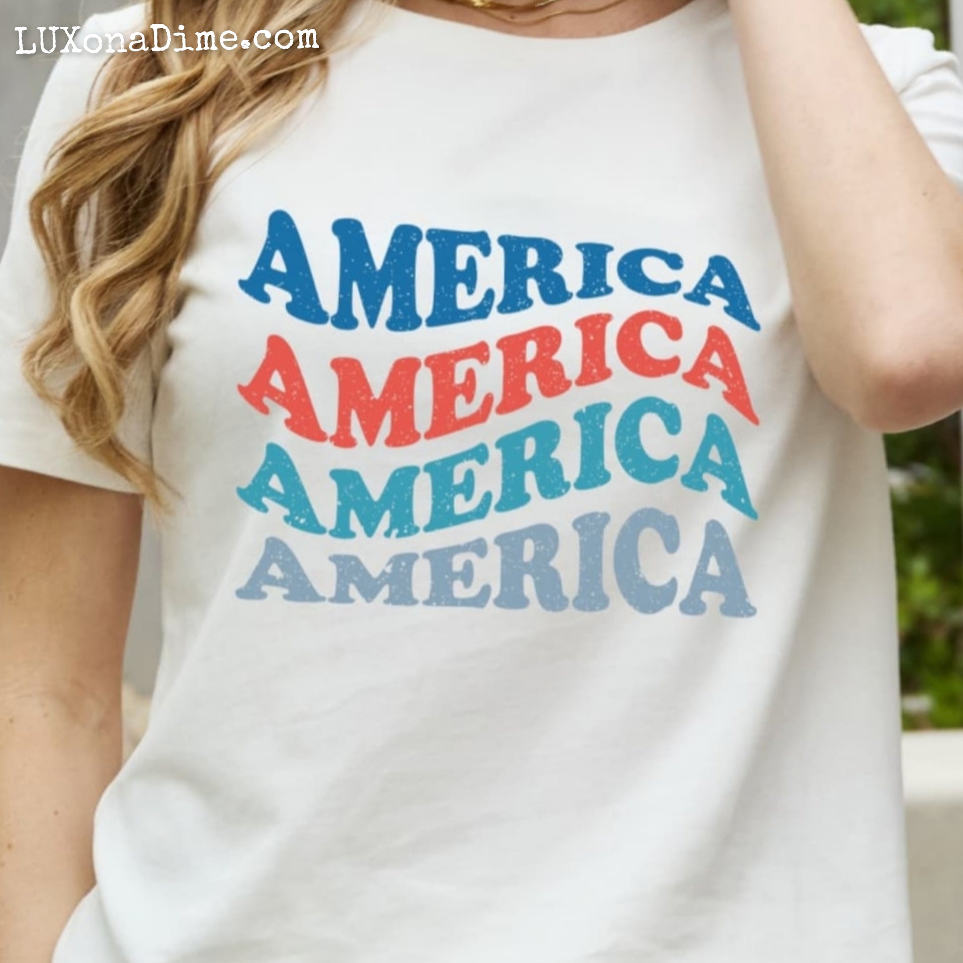 Solid white top with red and blue AMERICA wavy graphic in large print on the front.