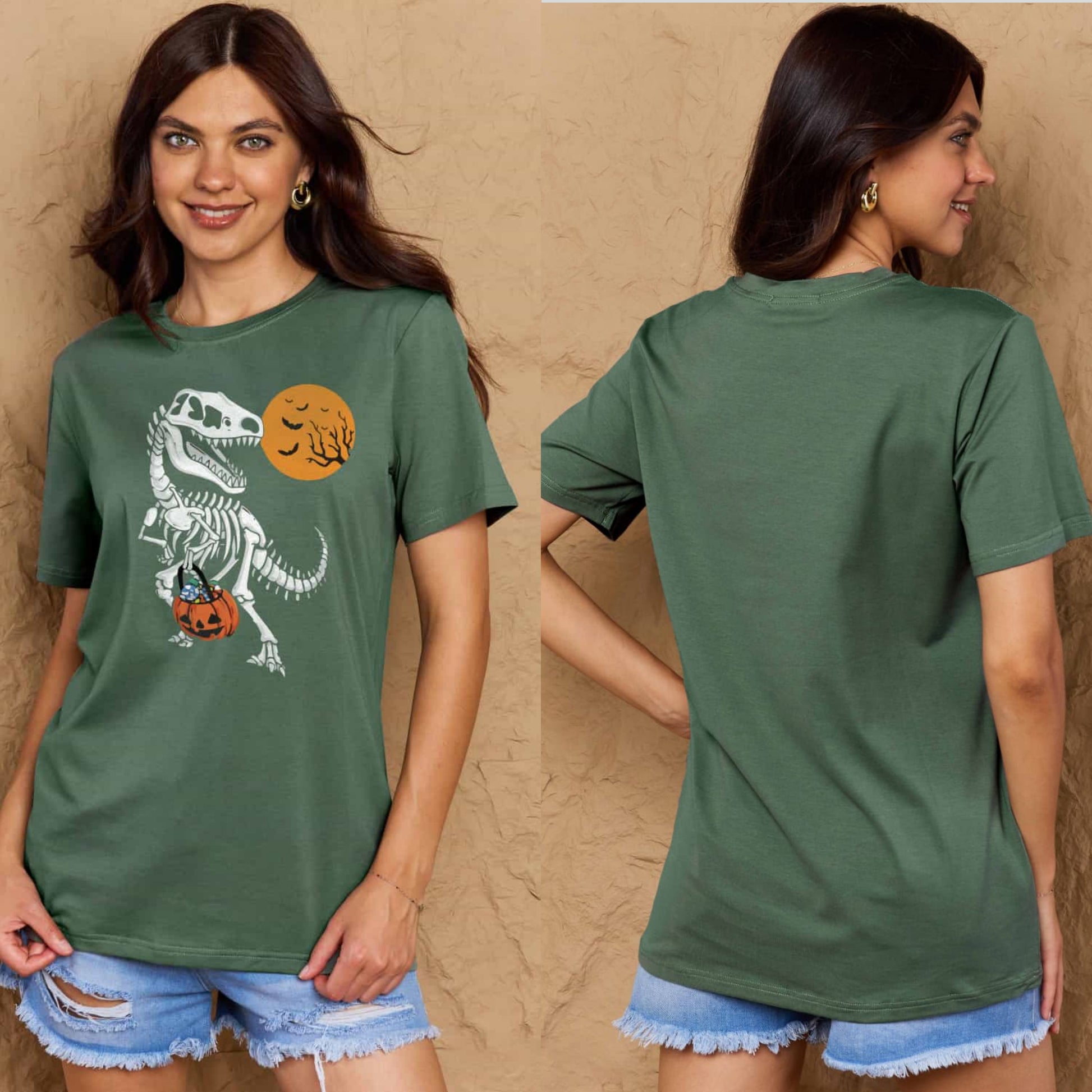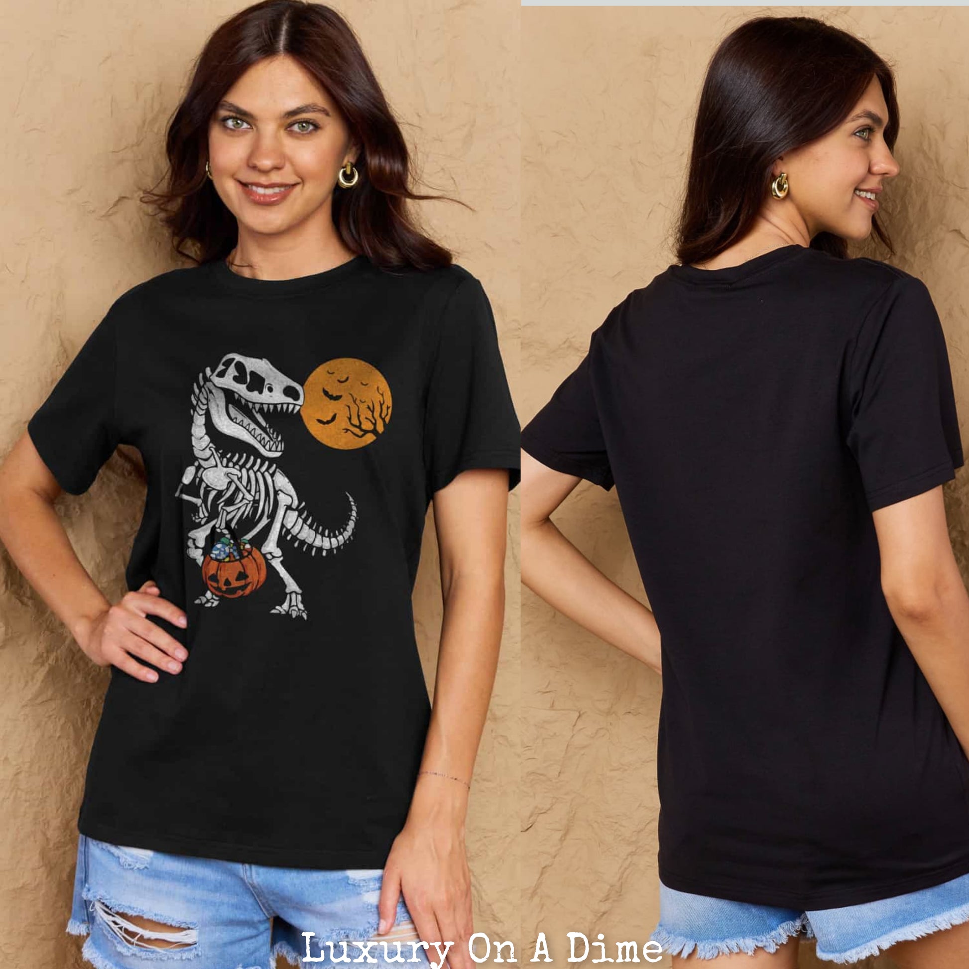 T-Rex Skeleton Trick or Treating Dinosaur Funny Graphic Tee Shirt Halloween Top