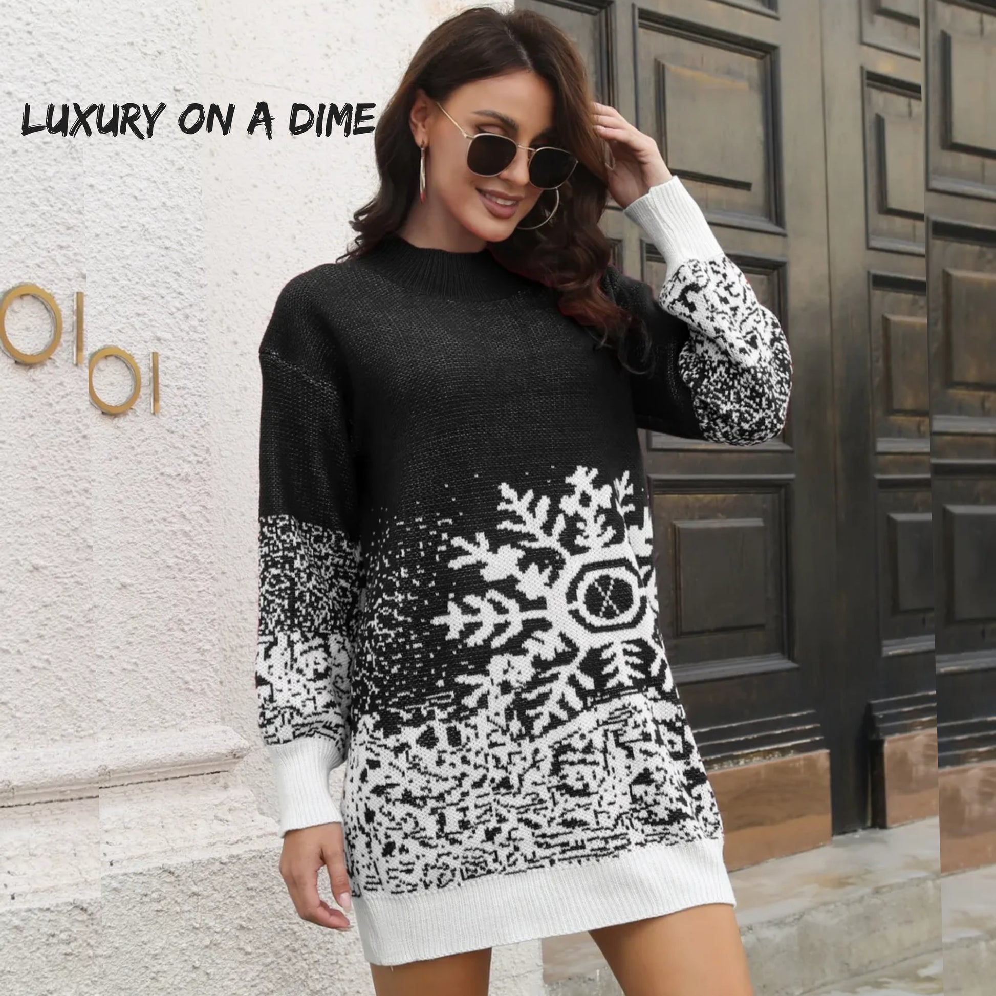Contrasting Color Snowflake Classic Knit Long Sleeve Mini Sweater Dress