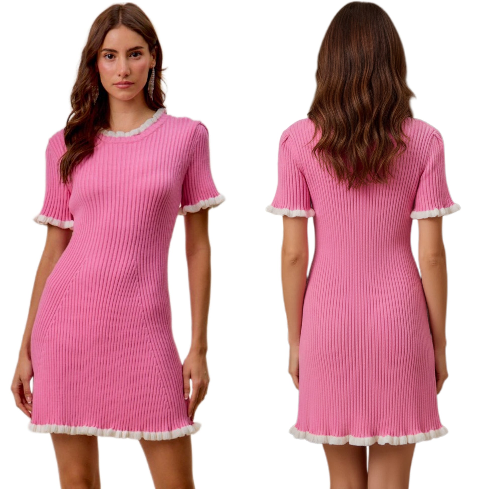 SO ME Contrast Ruffle Ribbed Sweater Knit Mini Dress Round Neck Short Sleeve Pink
