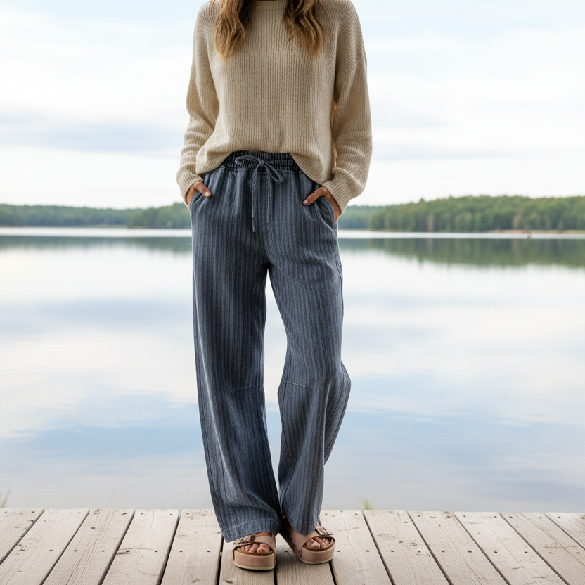 These denim horseshoe barrel jeans feature a relaxed silhouette defined by curved leg shaping and a loose, easy drape through the body. Vertical stripe patterning adds visual texture and elongation, while reinforcing a retro-inspired layout rooted in casual heritage design. The high-rise waist enhances the natural drape while preventing muffin top. A drawstring elastic waistband introduces adjustable comfort and a laid-back structure, balancing softness with functional detailing. The barrel leg construction creates a sculptural profile that feels intentional without appearing rigid, allowing natural movement and ease. Subtle paneling at the knees enhances shape and dimension, contributing to a workwear-influenced look with everyday wearability. The denim construction maintains a sturdy yet broken-in feel, supporting a relaxed fit that aligns with vintage casual and mom-style influences. Overall, the western design blends nostalgic stripe detailing with modern comfort, resulting in a versatile silhouette that emphasizes ease, structure, and timeless appeal.