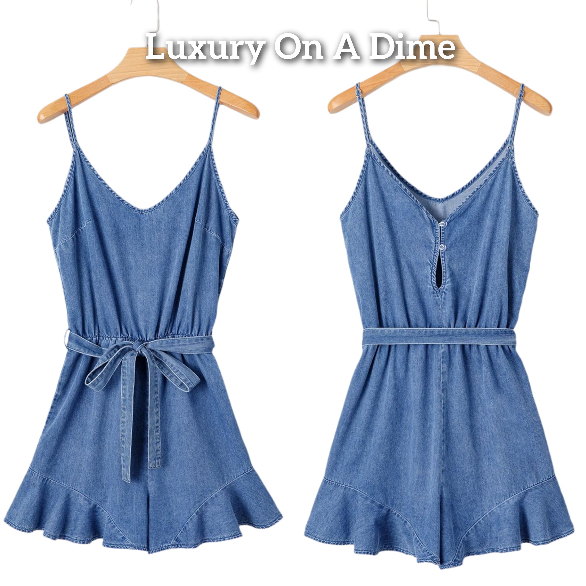 Denim Ruffle Flare Shorts Romper Sleeveless Belted Jean Chambray One-piece
