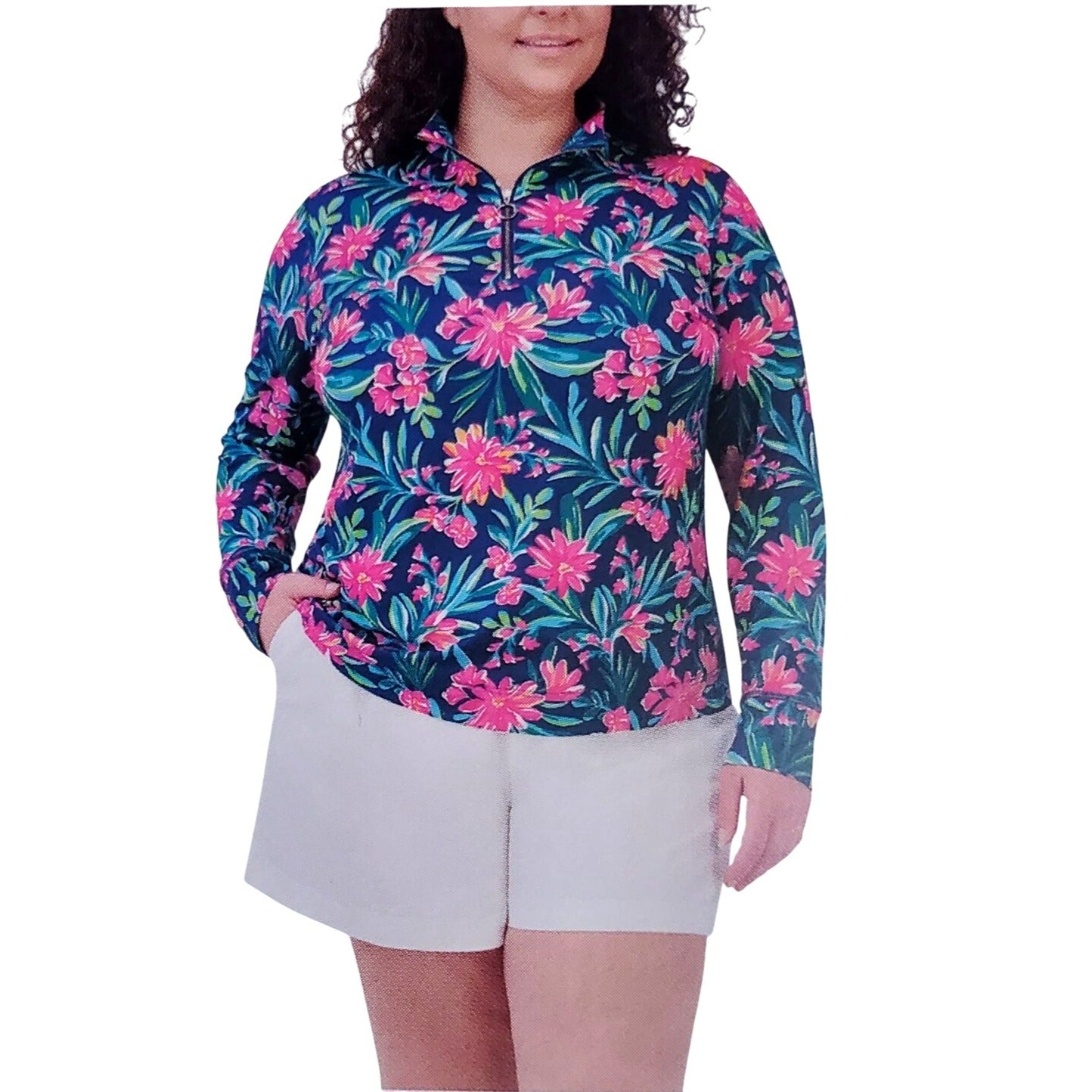 Whether you're hitting the court or running errands, this playful Palm Beach tropical pullover blends activewear performance with effortless style.