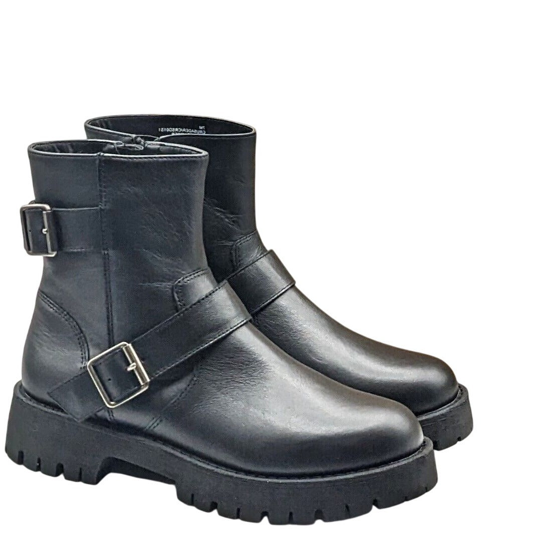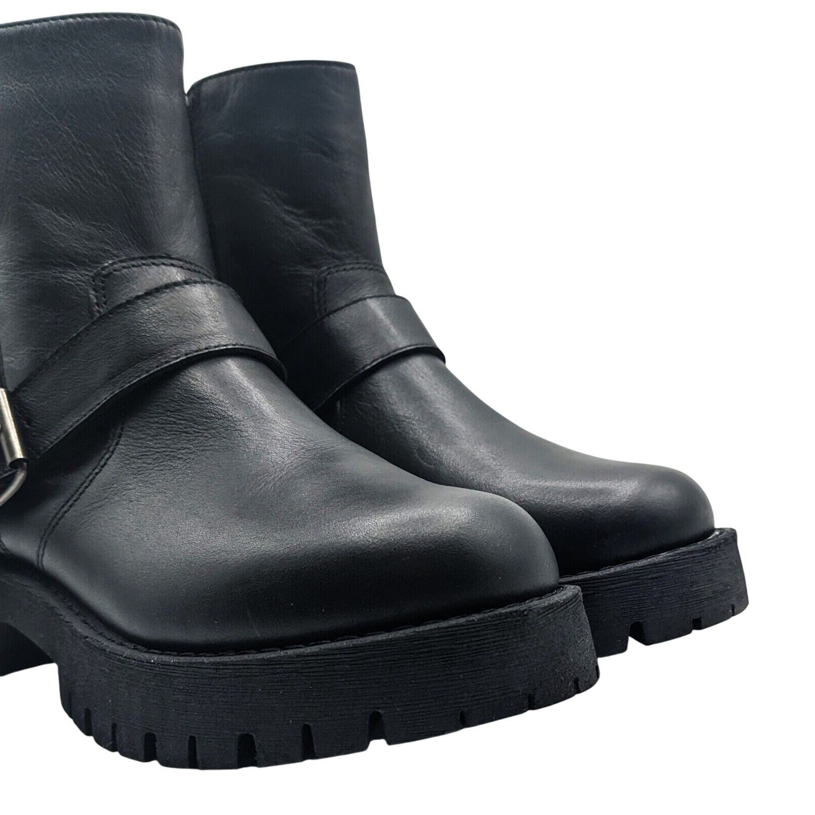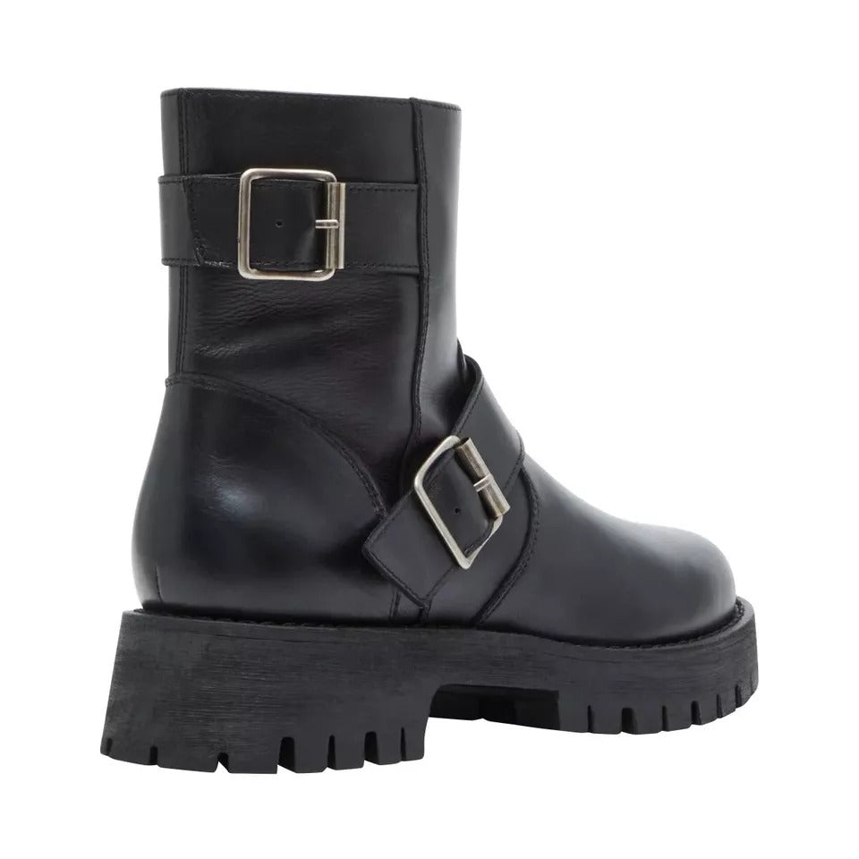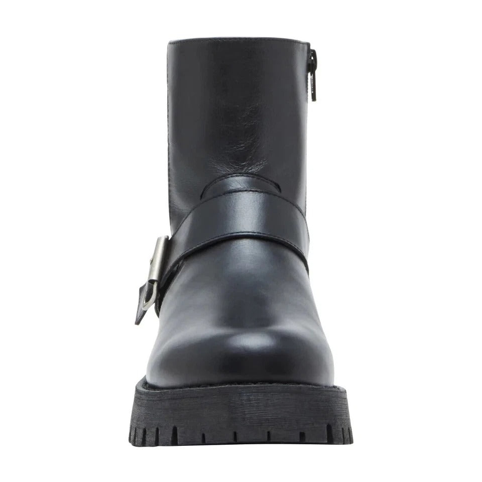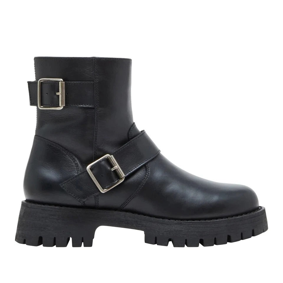 This chunky ankle boot features a bold silhouette anchored by a deeply lugged sole and substantial buckles, adding an instant statement to your everyday look. The sleek leather upper is reinforced with wide strap accents and polished metal hardware, offering durability with an edge. A round toe and above-ankle rise deliver structure without stiffness, while the interior side zipper ensures easy on and off. Rugged and fashion-forward, this pair channels biker, rock, and utilitycore aesthetics. Whether navigating city streets or weekend errands, these boots embody functionality through a trend-aware lens.