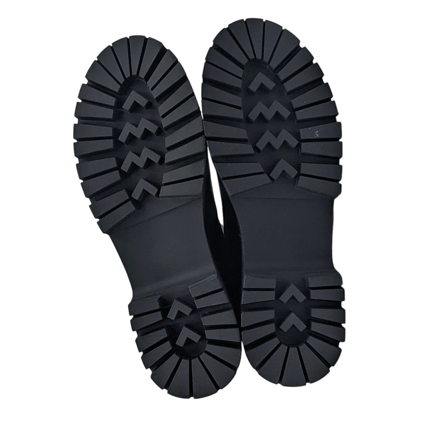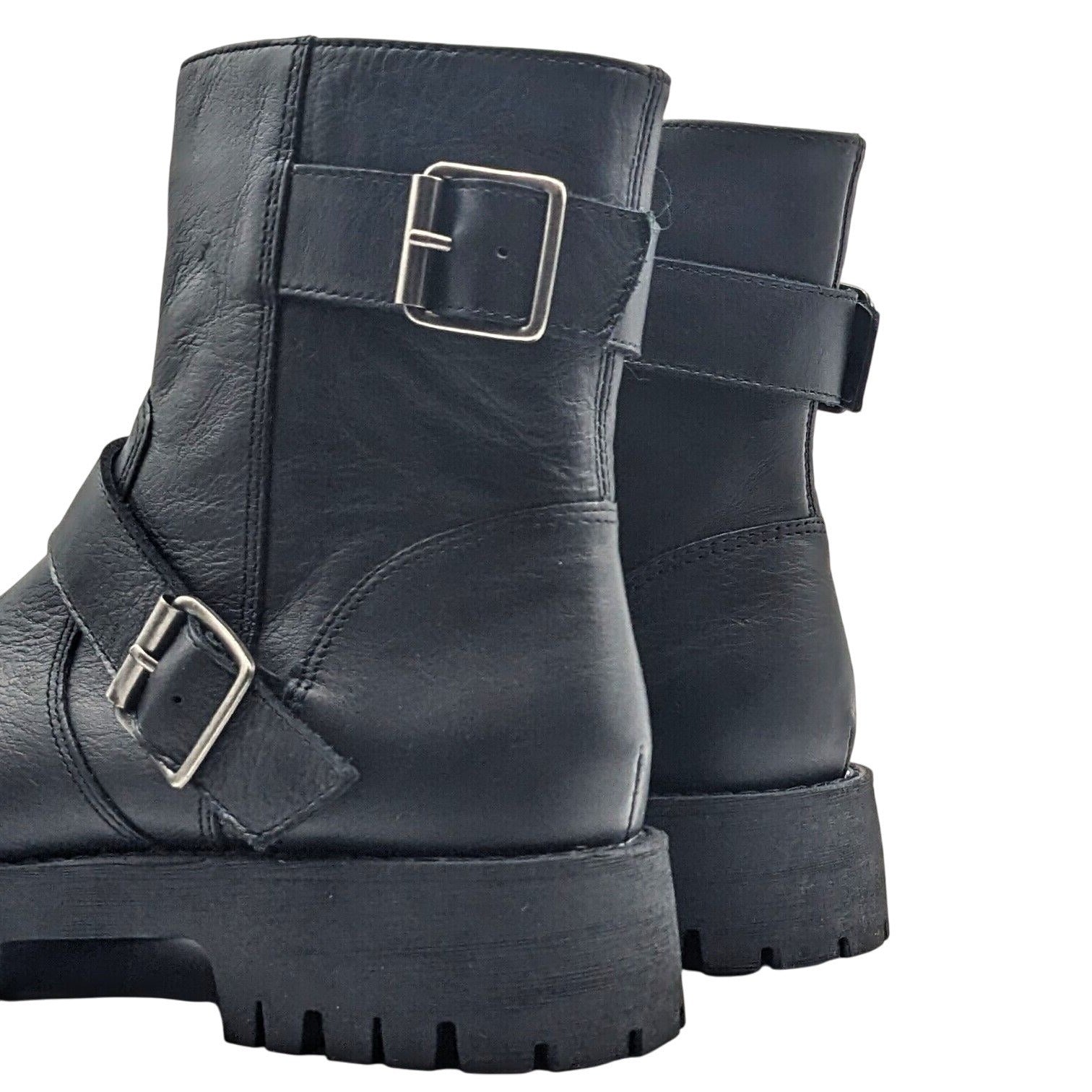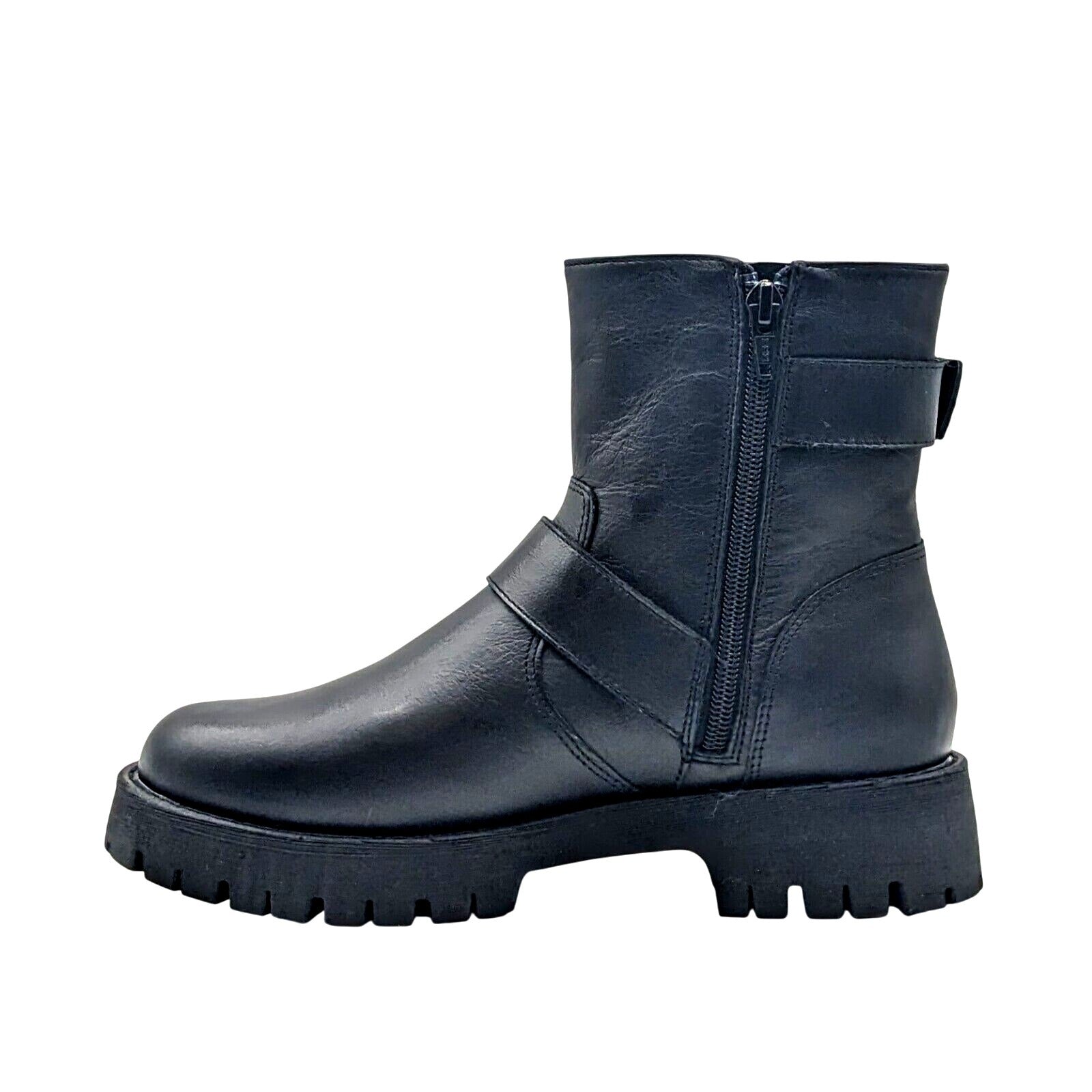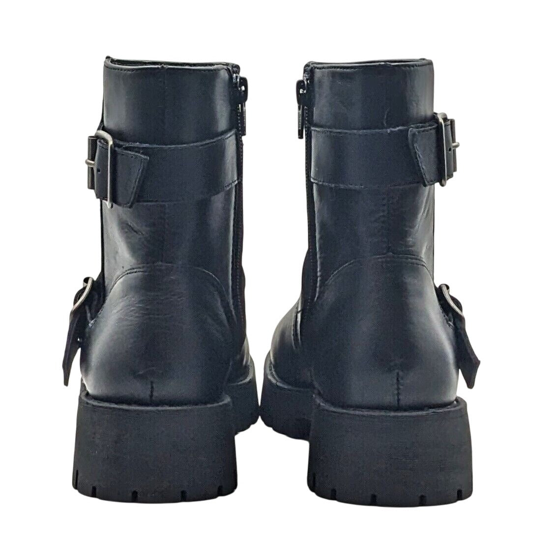 This chunky ankle boot features a bold silhouette anchored by a deeply lugged sole and substantial buckles, adding an instant statement to your everyday look. The sleek leather upper is reinforced with wide strap accents and polished metal hardware, offering durability with an edge. A round toe and above-ankle rise deliver structure without stiffness, while the interior side zipper ensures easy on and off. Rugged and fashion-forward, this pair channels biker, rock, and utilitycore aesthetics. Whether navigating city streets or weekend errands, these boots embody functionality through a trend-aware lens.