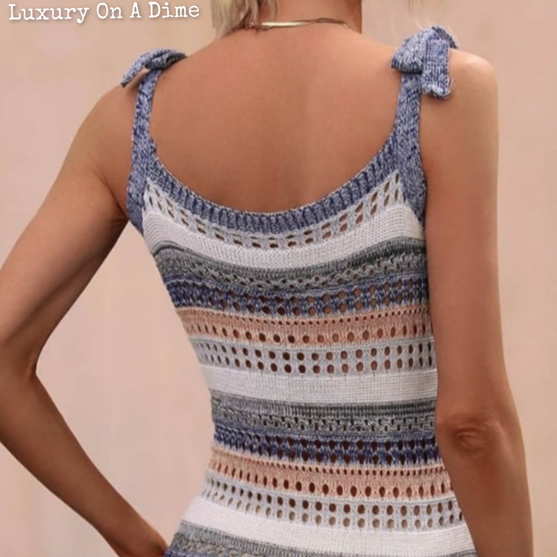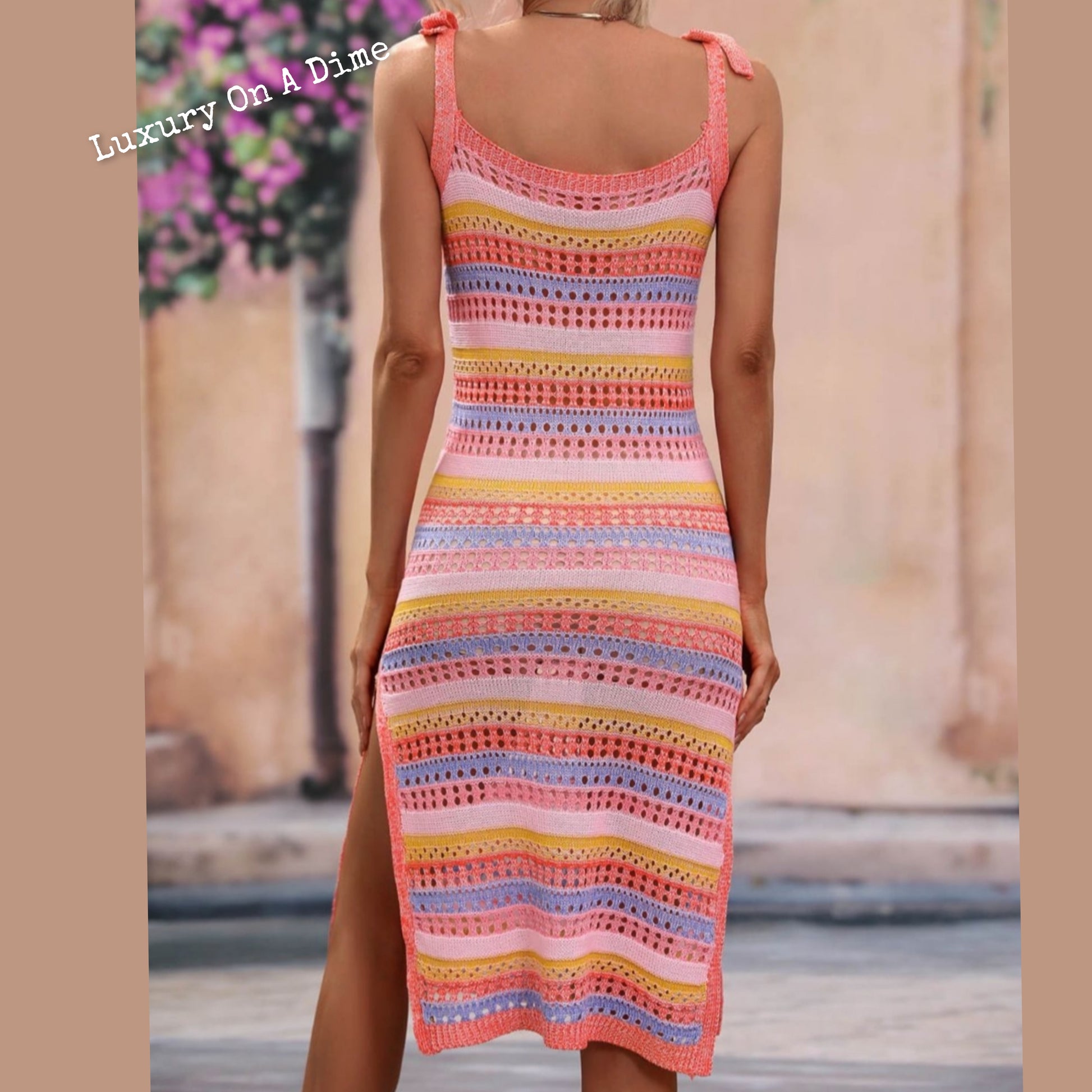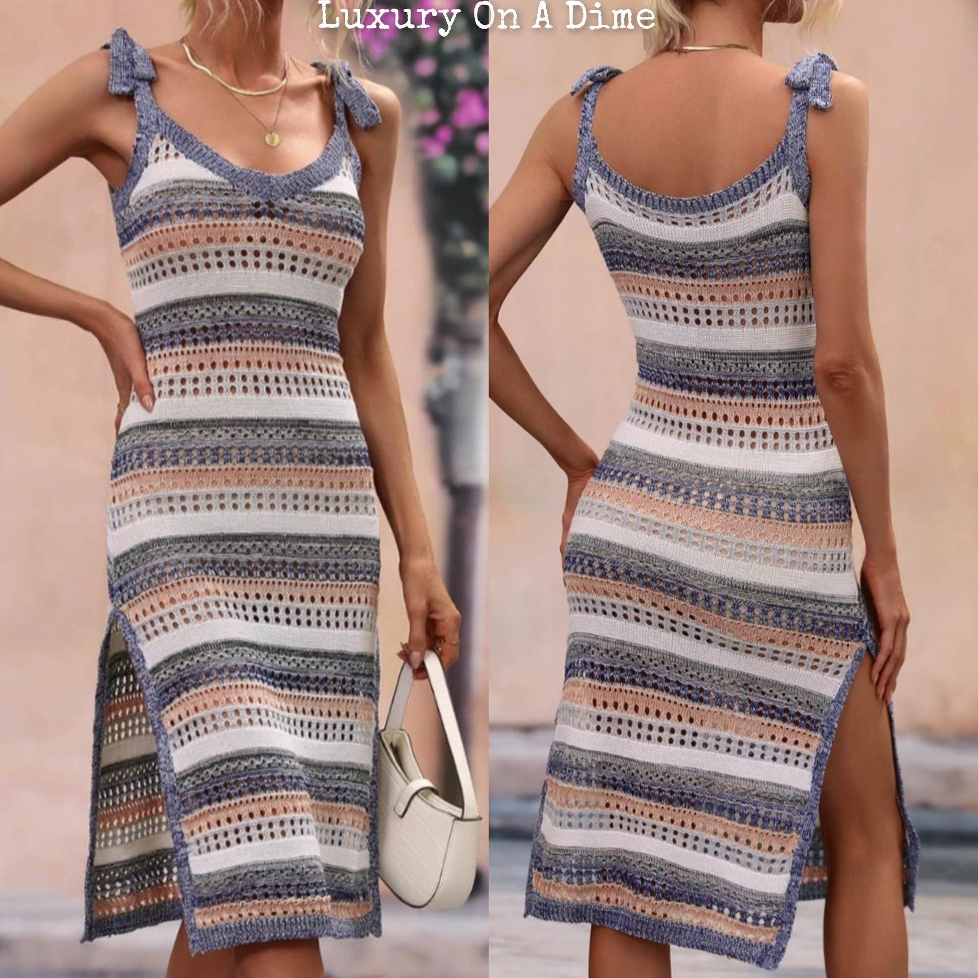 Retro Cutout Openwork Knit Tie Shoulder Stripe Swimwear Cover Up Dress