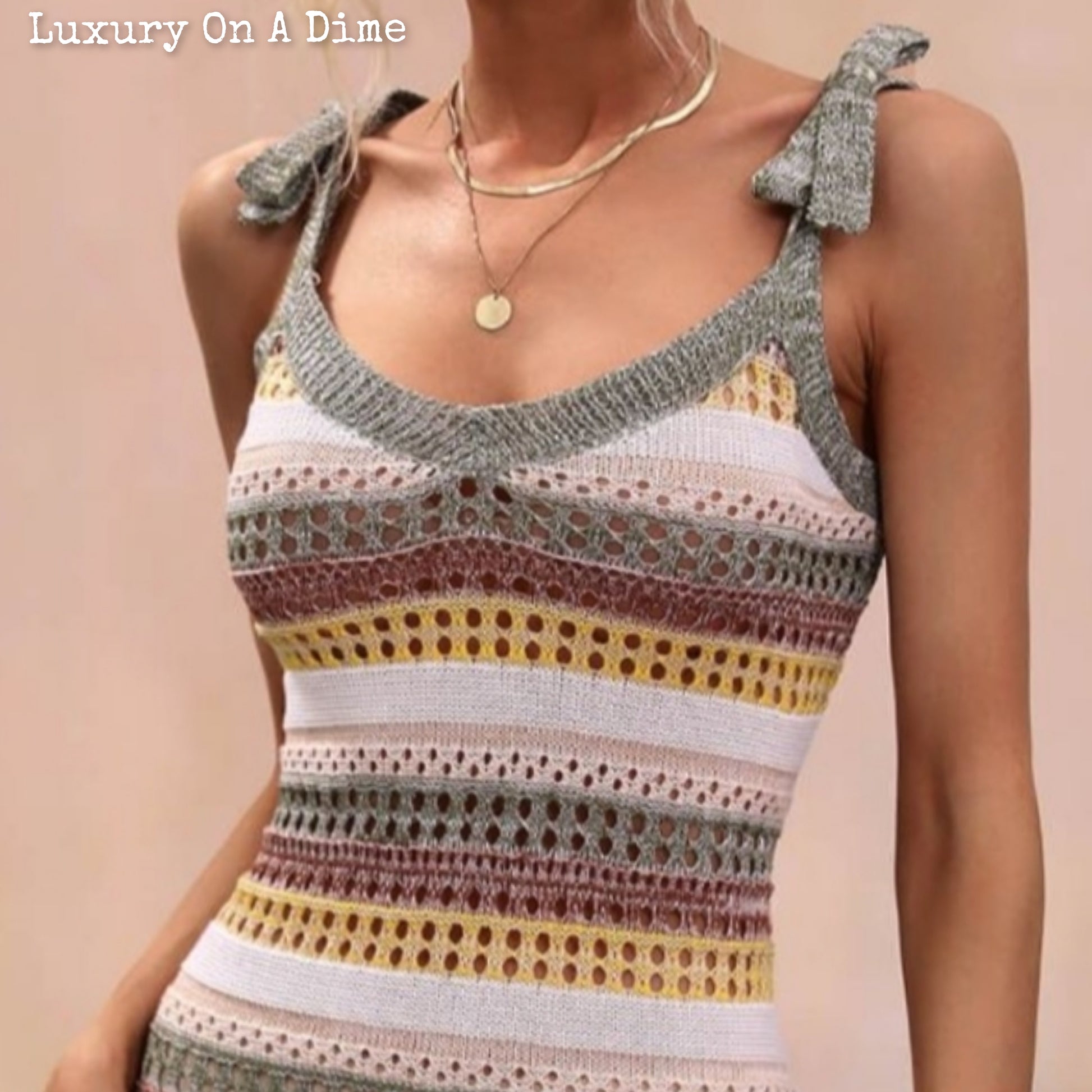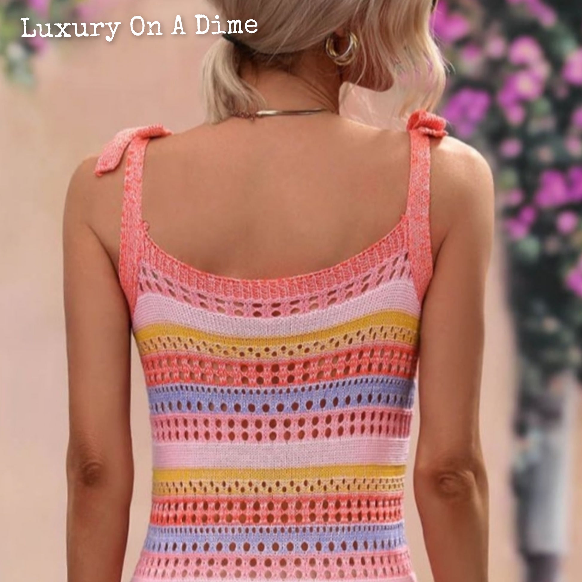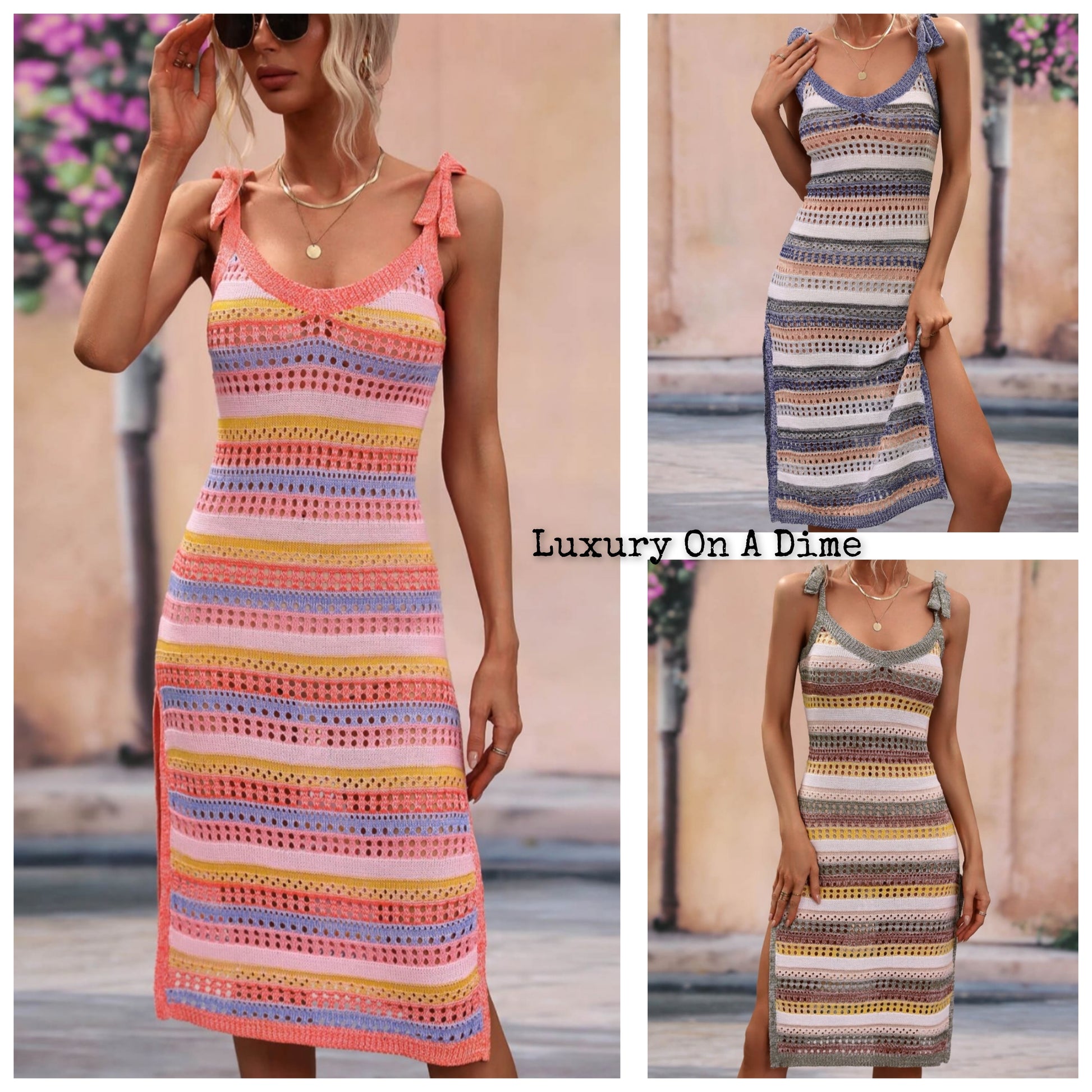 Retro Cutout Openwork Knit Tie Shoulder Stripe Swimwear Cover Up Dress