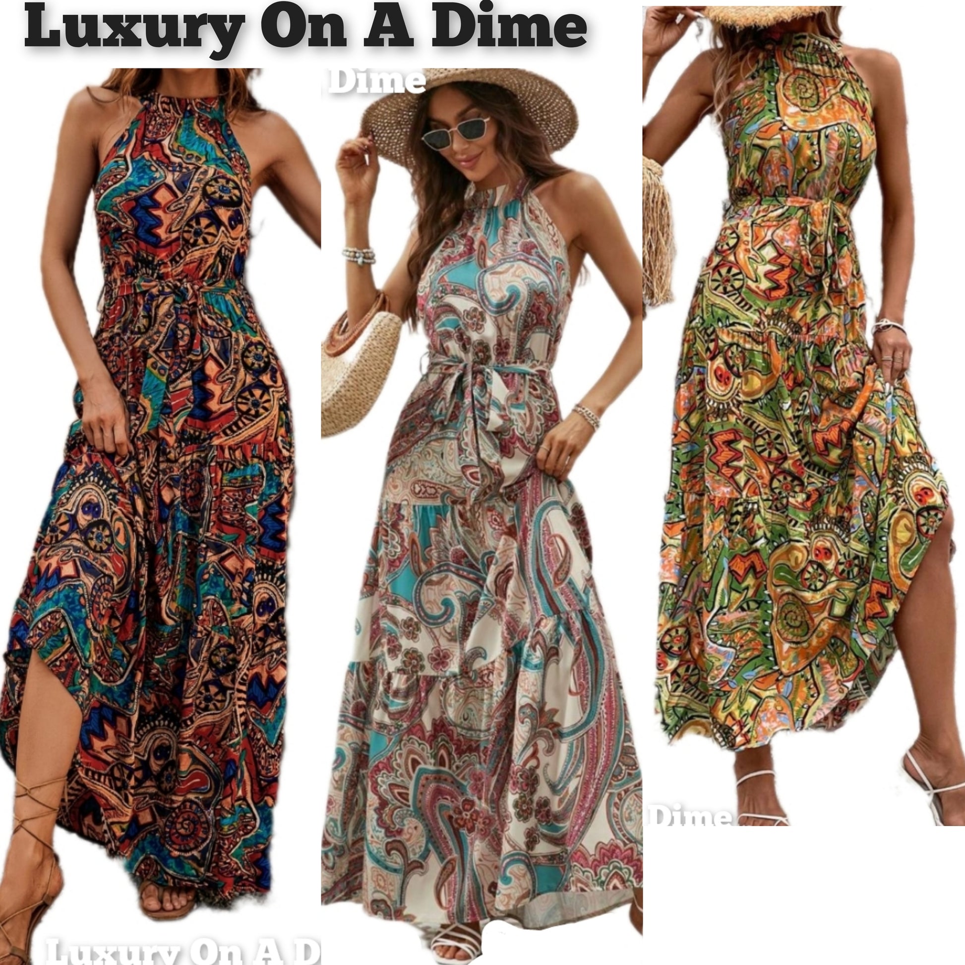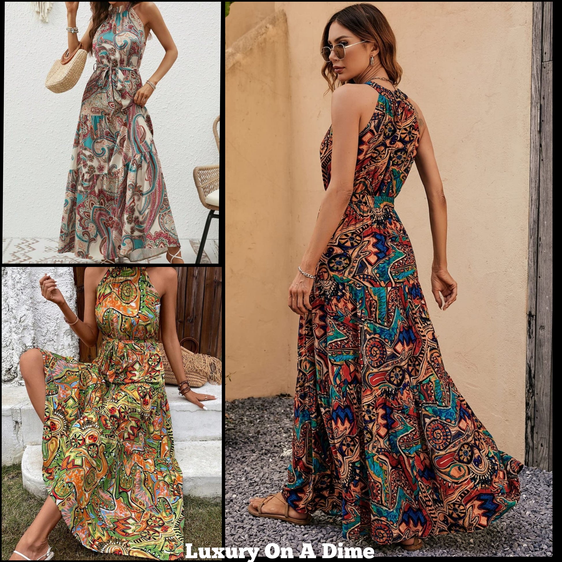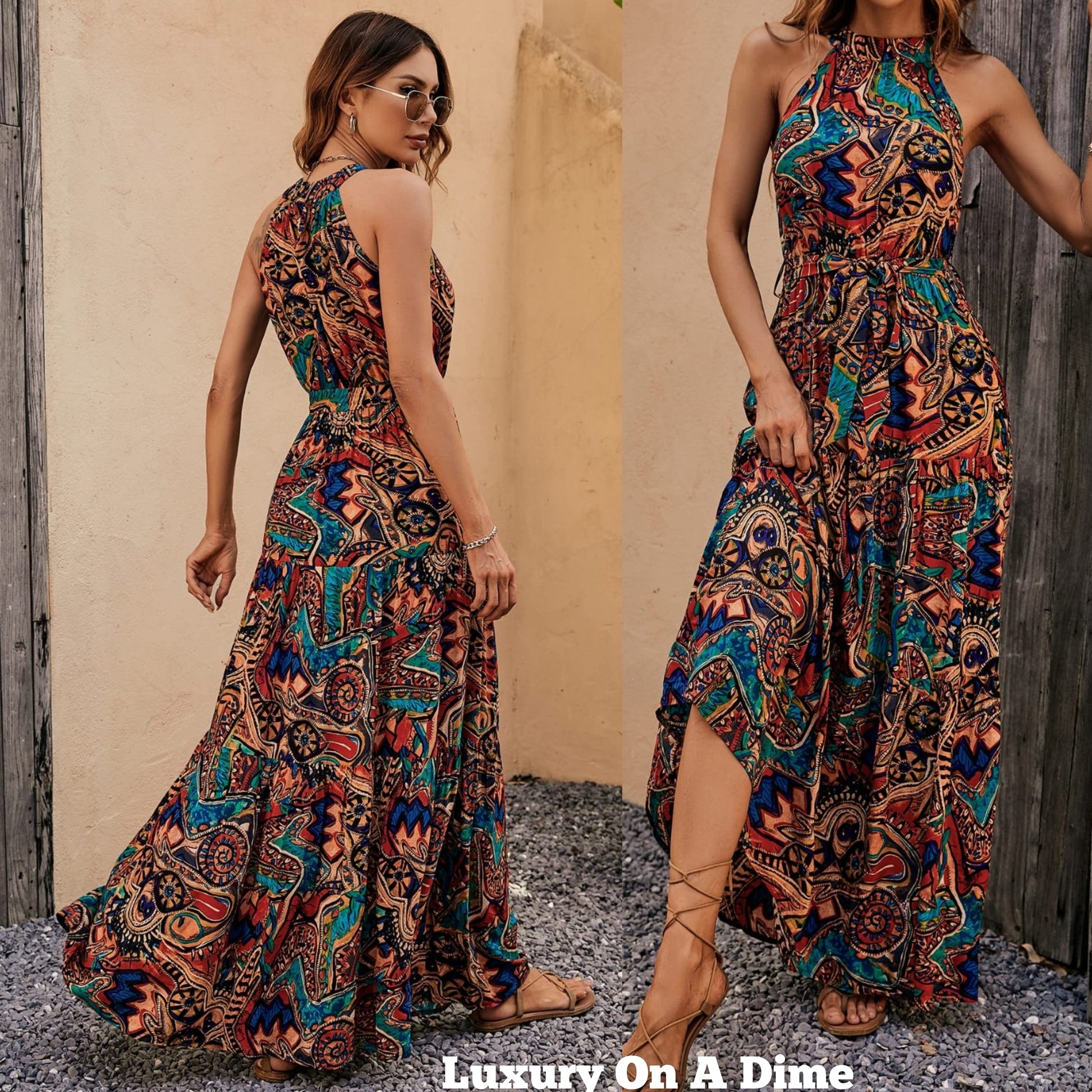 Grecian High-Neck Tie Belt Sleeveless Bold Colorful Tiered Maxi Summer Dress