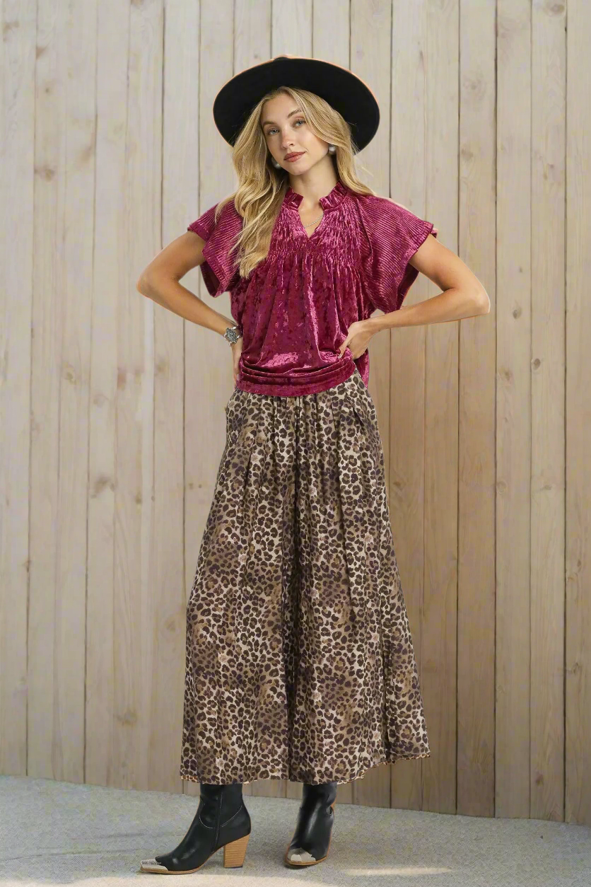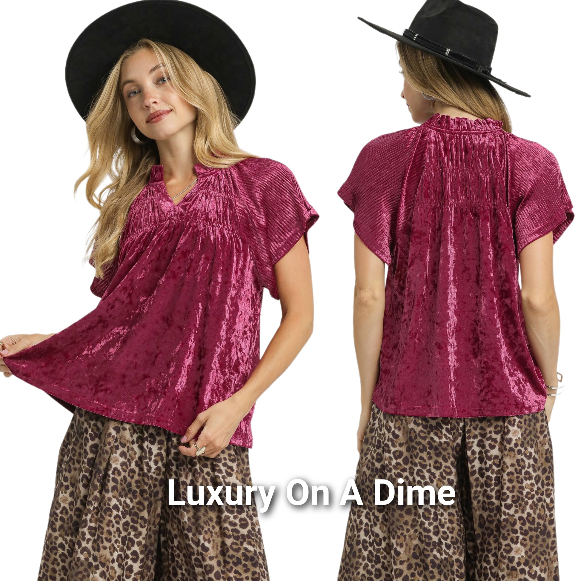 Umgee Crushed Velvet 70s Retro Ruffle Neck Shirt Pleated Top Short Sleeve Blouse