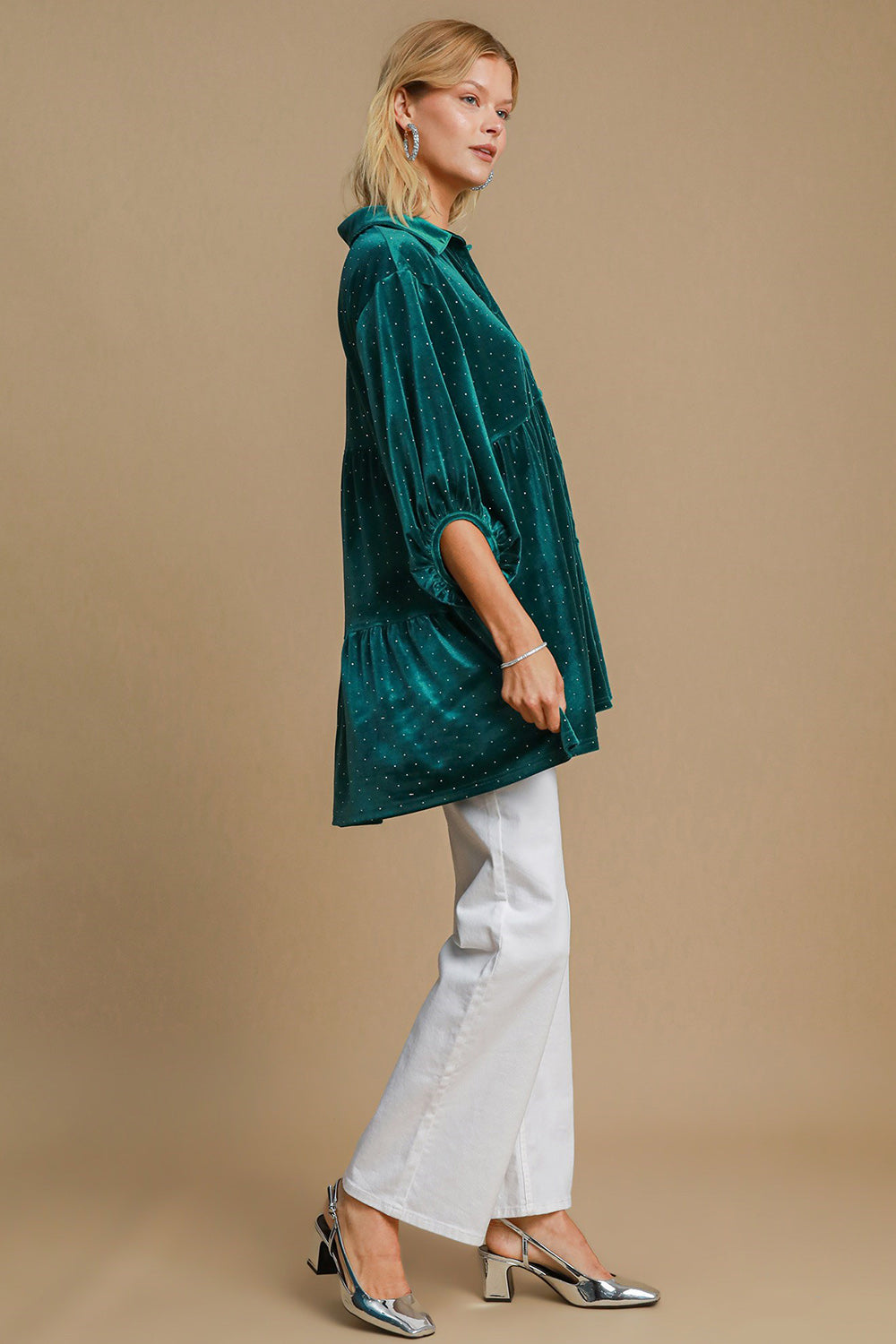 Umgee Velour Polka-dot Boho Oversized Tunic Top Babydoll Shirt Velour Blouse